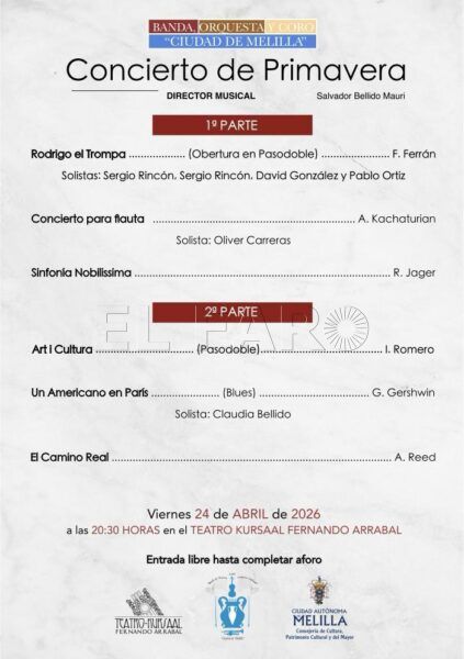 El repertorio del Concierto de Primavera responde precisamente a esa filosofía, apostando por la variedad estilística y por obras que supongan un estímulo interpretativo. De este modo, la cita no solo pone en valor el trabajo colectivo de la banda, sino también el talento individual de sus integrantes. Con esta propuesta, la Banda, Orquesta y Coros “Ciudad Autónoma de Melilla” invita al público a disfrutar de una velada que combina tradición, diversidad sonora y protagonismo solista, ofreciendo una panorámica completa de las posibilidades musicales de la formación.