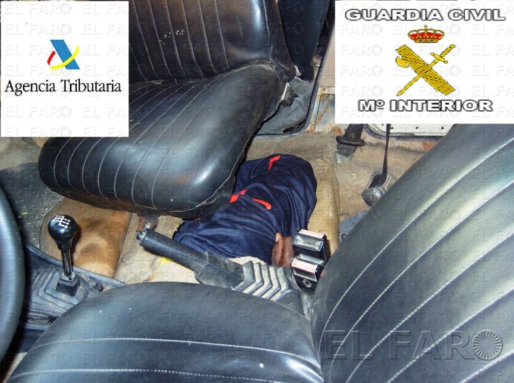 Al inspeccionar el vehículo los agentes localizaron a un subsahariano de 21 años oculto en un pequeño receptáculo. Para liberarlo tuvieron que desenroscar “cinco tuercas de cabeza hexagonal que sujetaban los asientos” y retirar la moqueta del habitáculo, explica la Comandancia. El inmigrante se encontraba encajonado, no podía realizar ningún movimiento y respiraba con dificultad. Tras ser rescatado, presentaba un fuerte dolor lumbar, entumecimiento y sufría espasmos en las extremidades superiores e inferiores. Después de recibir asistencia médica en ese mismo lugar, tuvo que ser trasladado al servicio de urgencias del Hospital Comarcal.