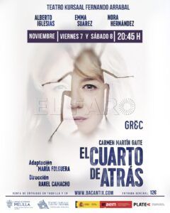 La Consejería de Cultura, Patrimonio Cultural y del Mayor se complace en anunciar la próxima representación de la obra teatral El Cuarto de Atrás, una adaptación escénica de la célebre novela de Carmen Martín Gaite, que tendrá lugar en el Teatro Kursaal Fernando Arrabal los días viernes 7 y sábado 8 de noviembre a las 20:45 horas.