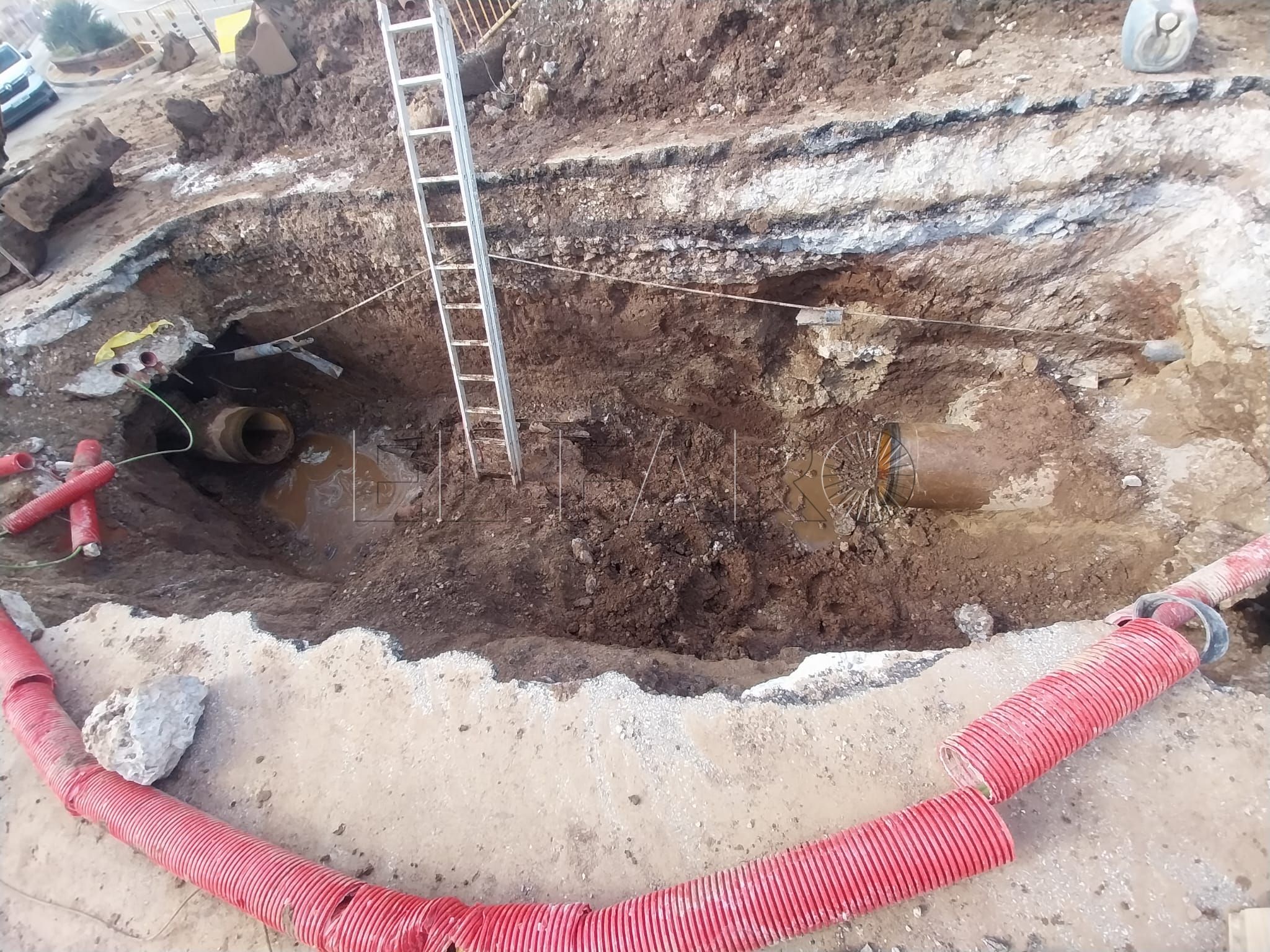 La rotura se produjo en una tubería antigua que permanecía como reserva junto a la nueva y que obligó a la Policía Local a cortar, el domingo, el cruce entre la calle Andalucía y la carretera Alfonso XIII hasta la rotonda del antiguo Hospital Militar (sentido aeropuerto hacia el nuevo hospital), y los accesos desde las calles Mallorca y Coronel Cebollinos.