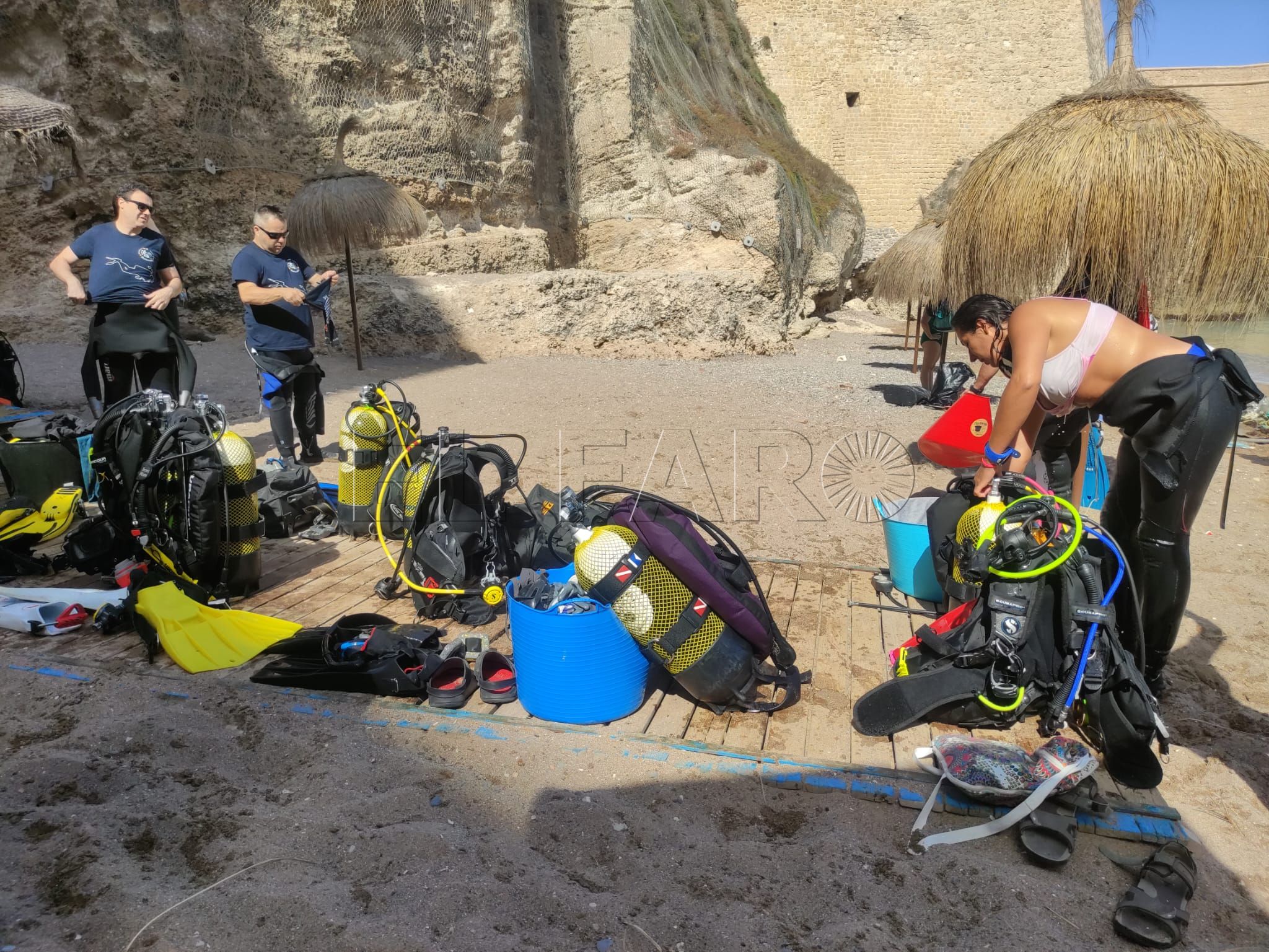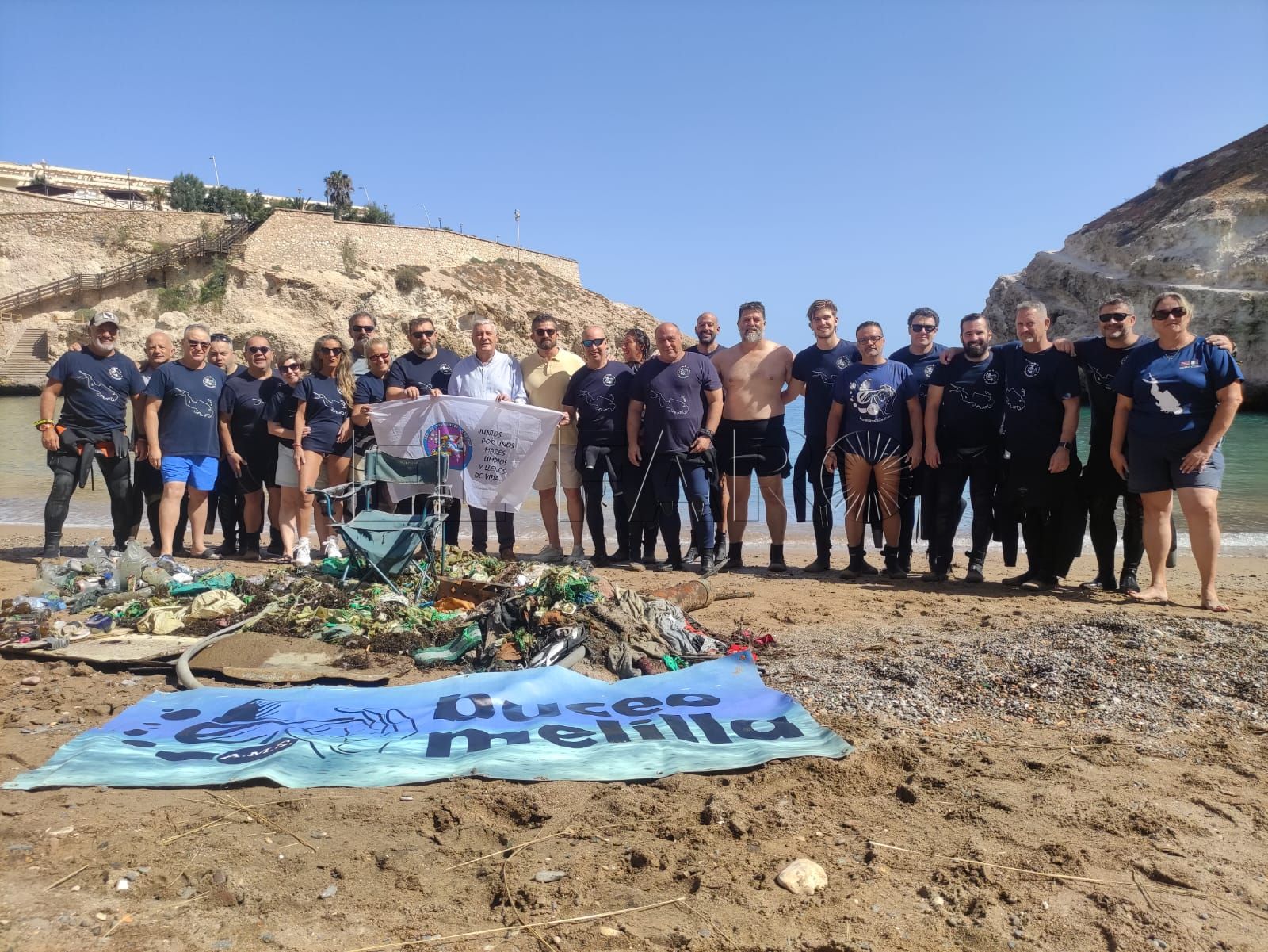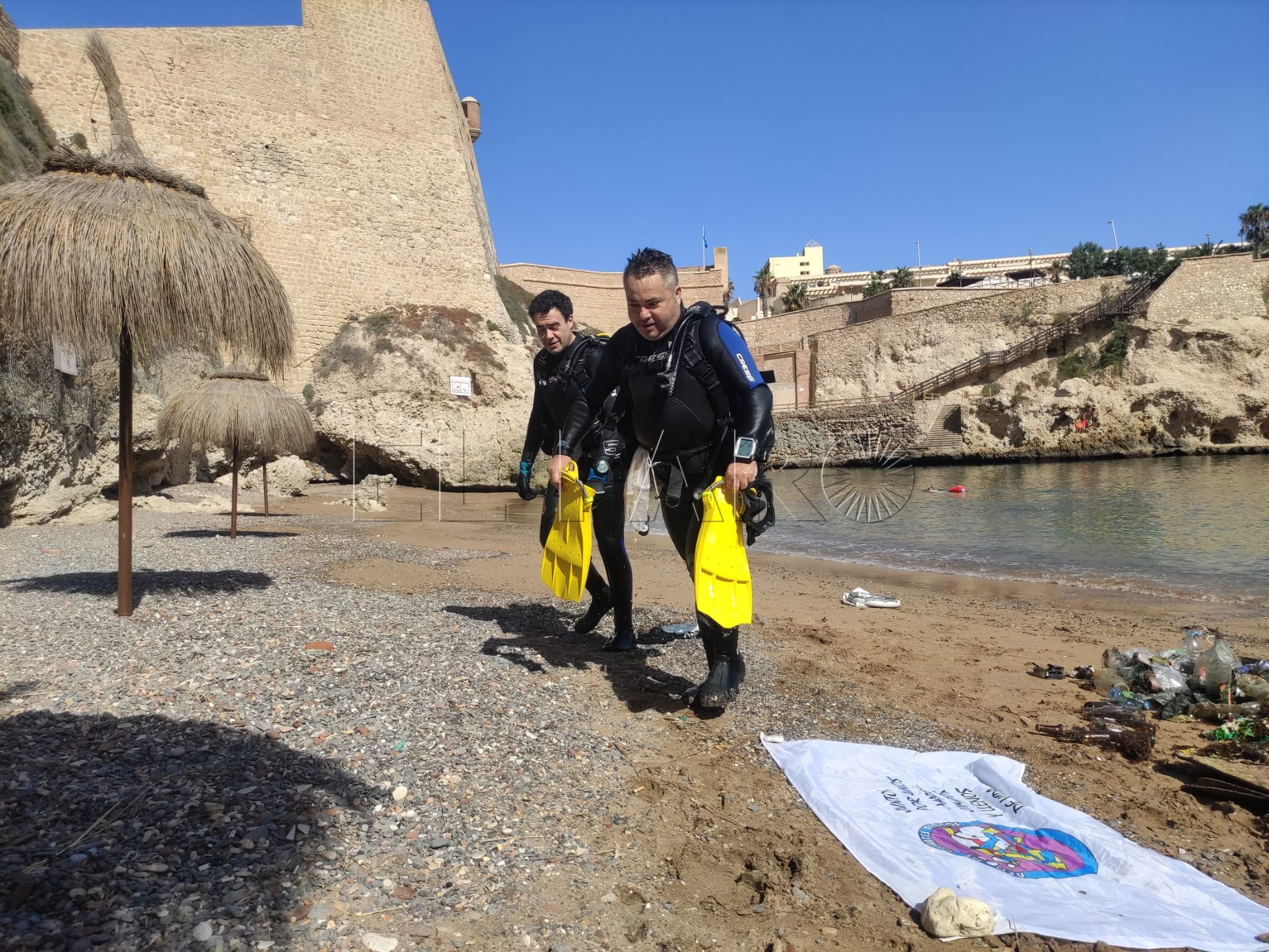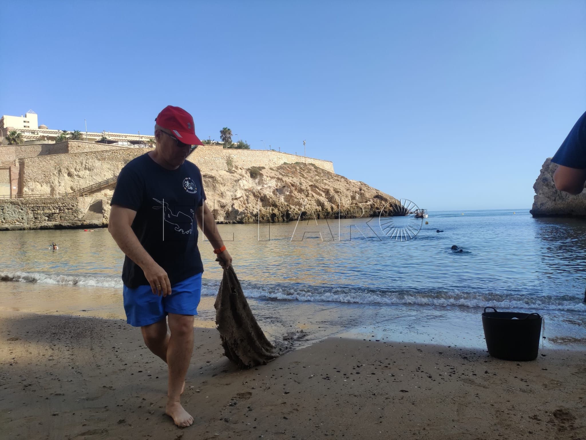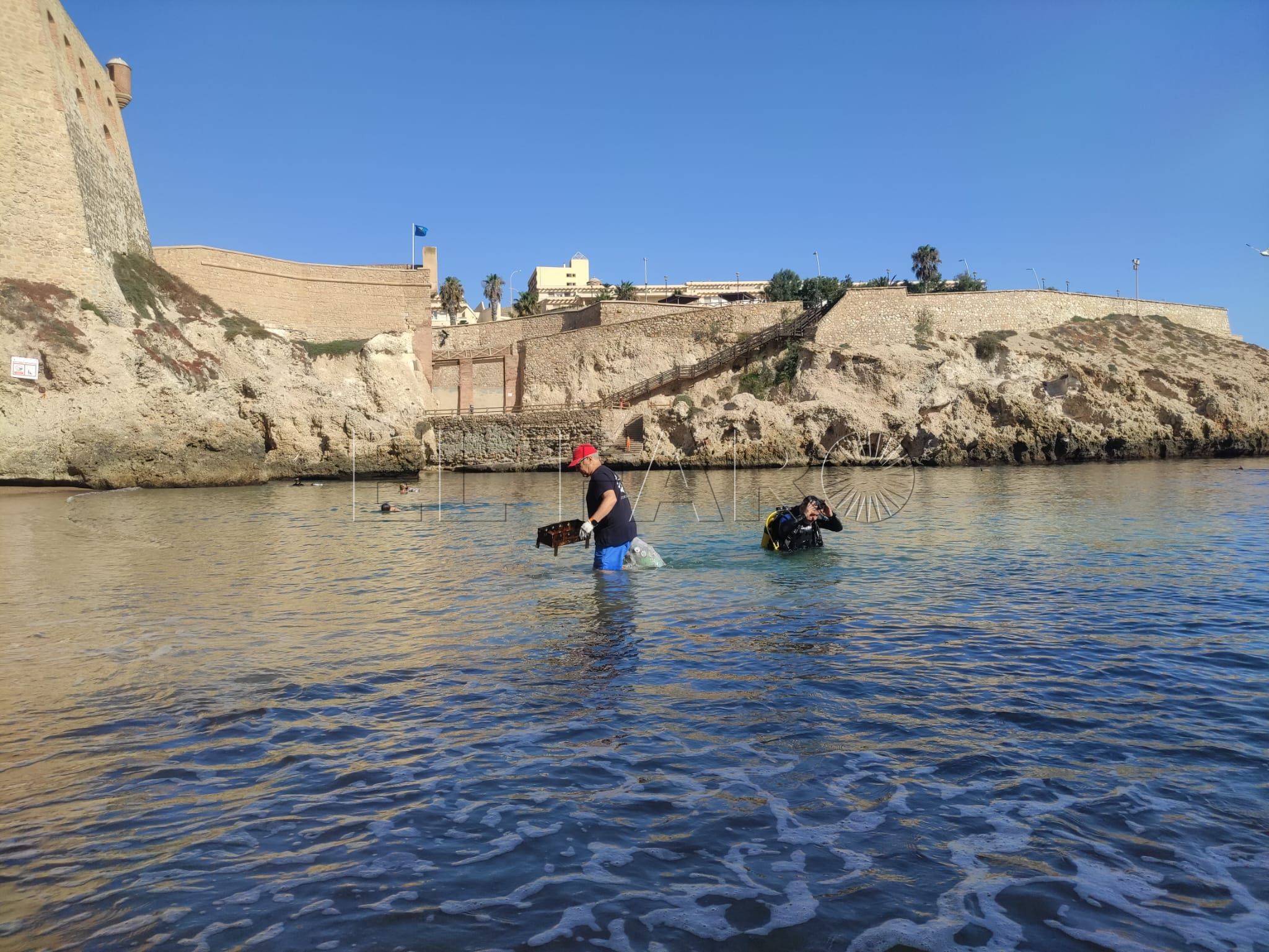 Asomando el sol desde la muralla, el mar se cubría de peces acuáticos con equipaciones de neopreno y más de 20 kilos a su espalda, cámaras submarinas y bolsas de tela blancas y negras en mano donde iban depositando la basura acumulada del fondo marino esta zona costera melillense. En la orilla, Carmen y Gregorio ayudaban a sacar los residuos y clasificarlos para entregarlos en Madrid. En la arena, en las sombrillas y en la pasarela de acceso se acumulaban flotadores naranjas de socorrismo, mochilas negras vacías, capazos, utensilios, vestimenta y toallas de los submarinistas.