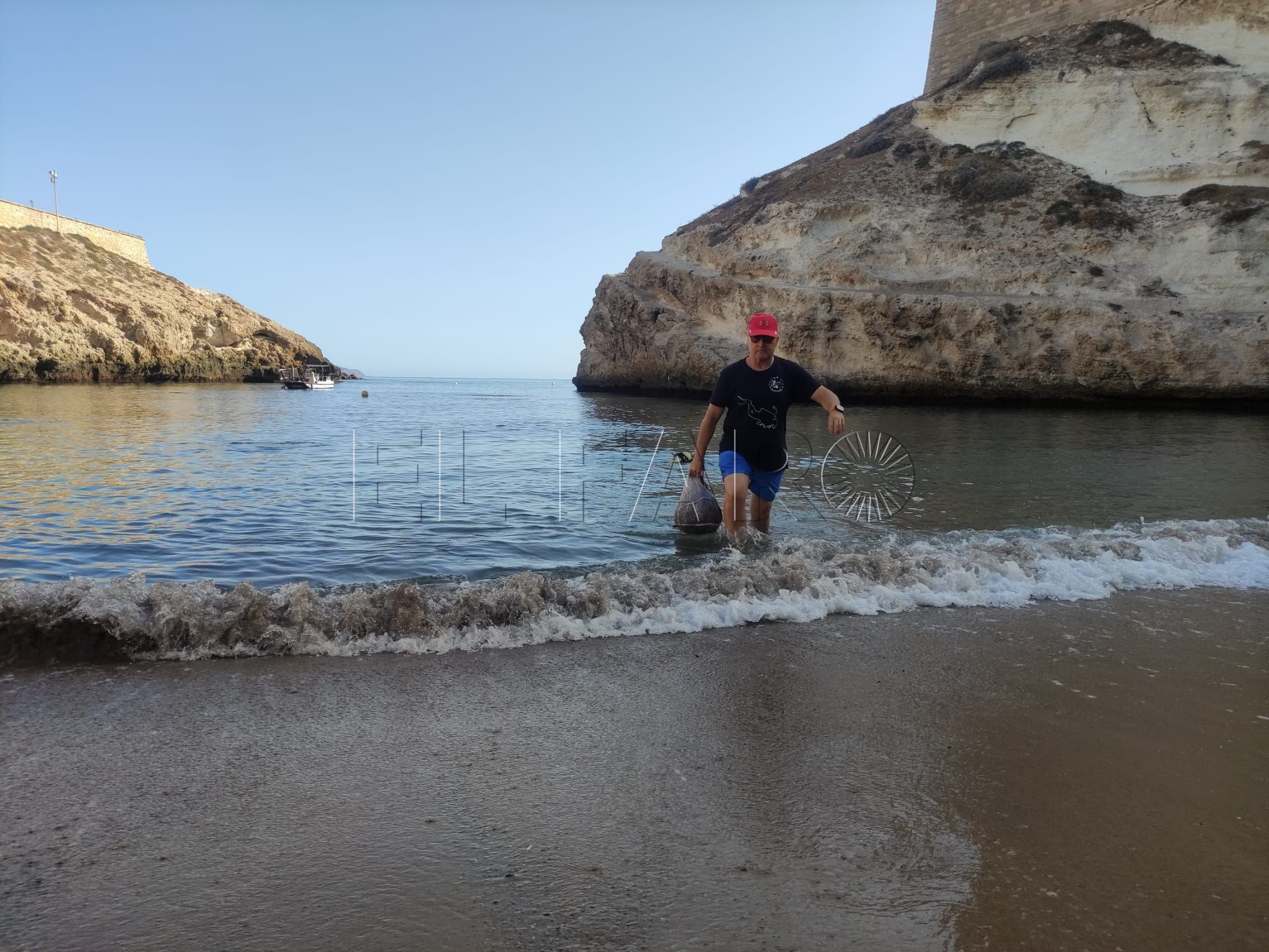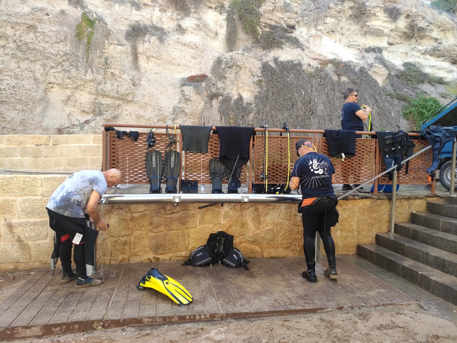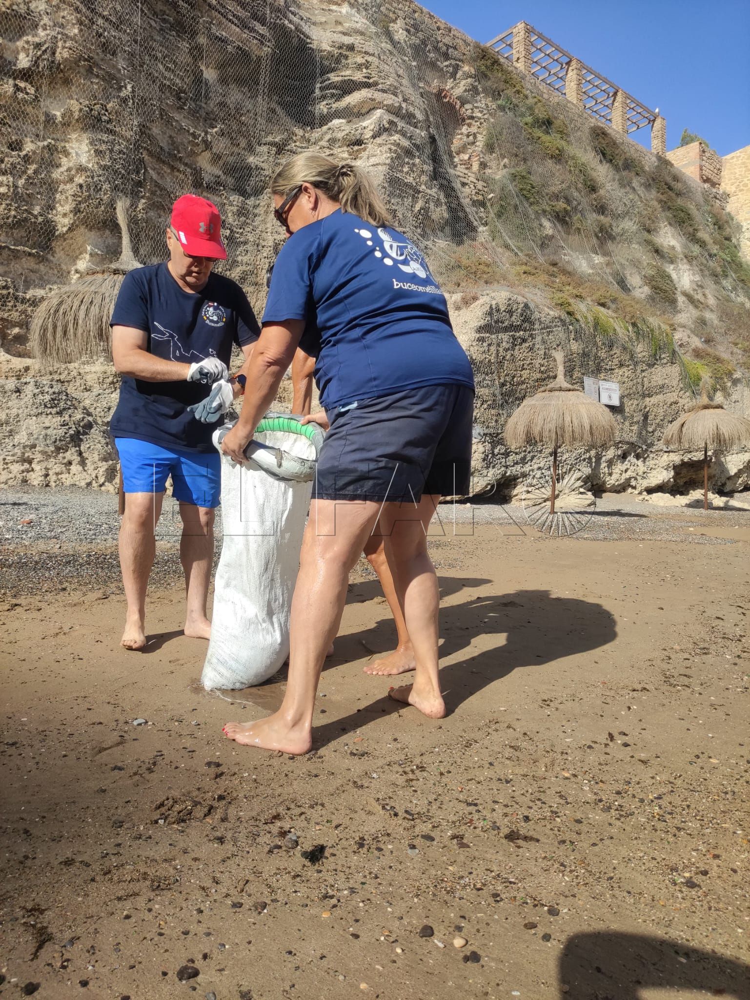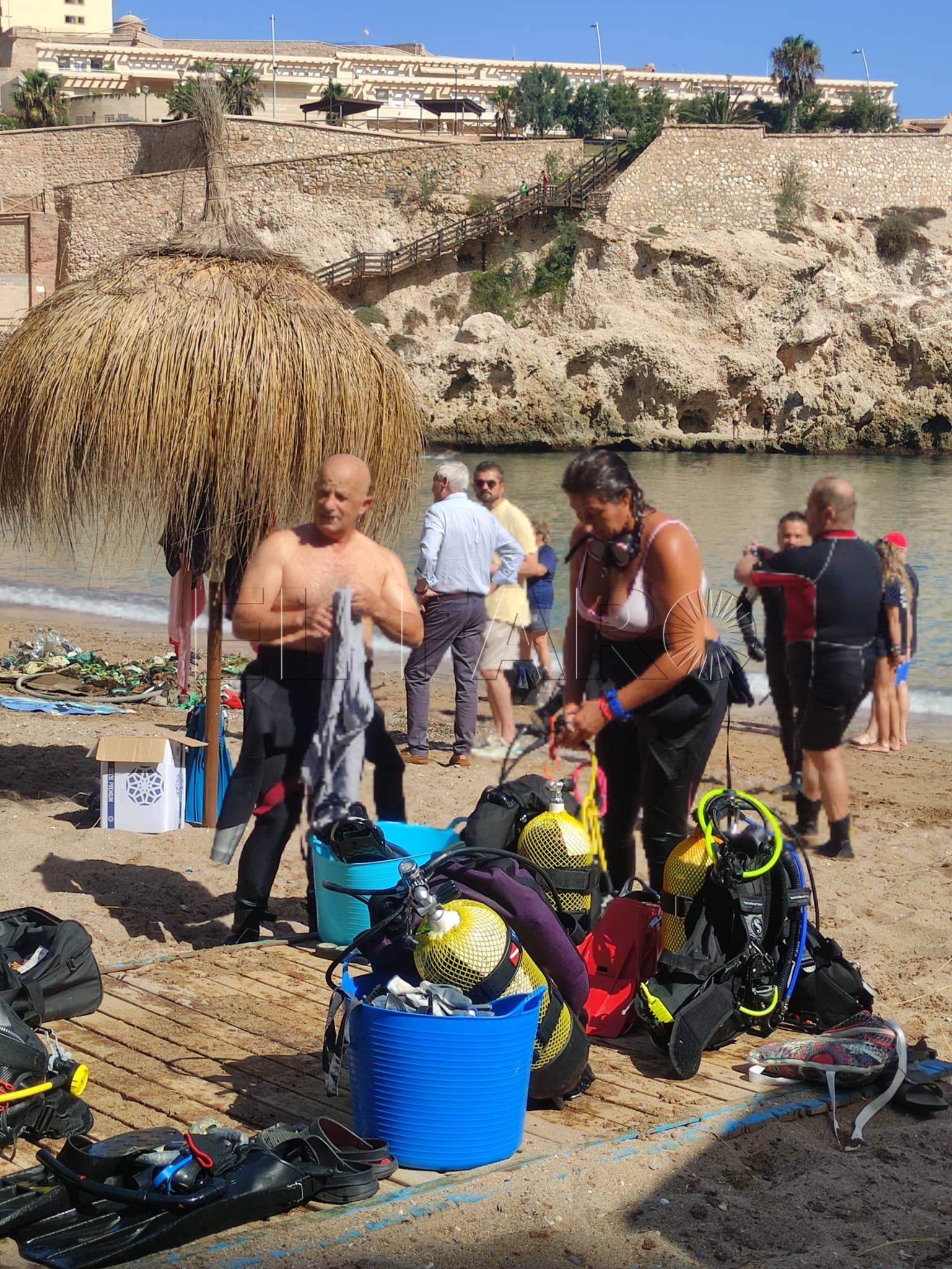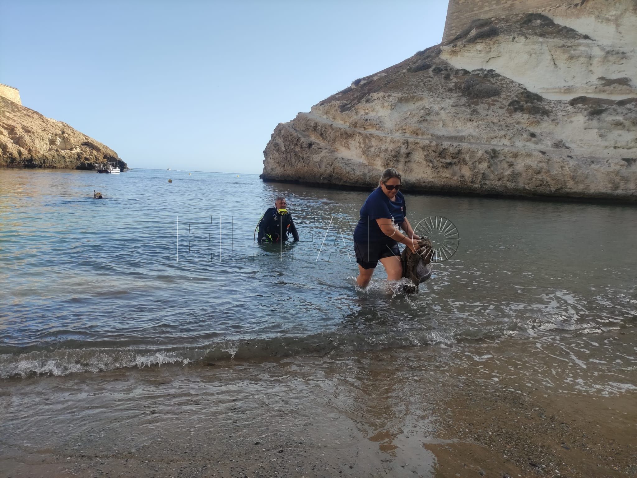 Asomando el sol desde la muralla, el mar se cubría de peces acuáticos con equipaciones de neopreno y más de 20 kilos a su espalda, cámaras submarinas y bolsas de tela blancas y negras en mano donde iban depositando la basura acumulada del fondo marino esta zona costera melillense. En la orilla, Carmen y Gregorio ayudaban a sacar los residuos y clasificarlos para entregarlos en Madrid. En la arena, en las sombrillas y en la pasarela de acceso se acumulaban flotadores naranjas de socorrismo, mochilas negras vacías, capazos, utensilios, vestimenta y toallas de los submarinistas.