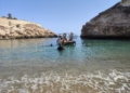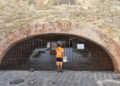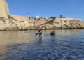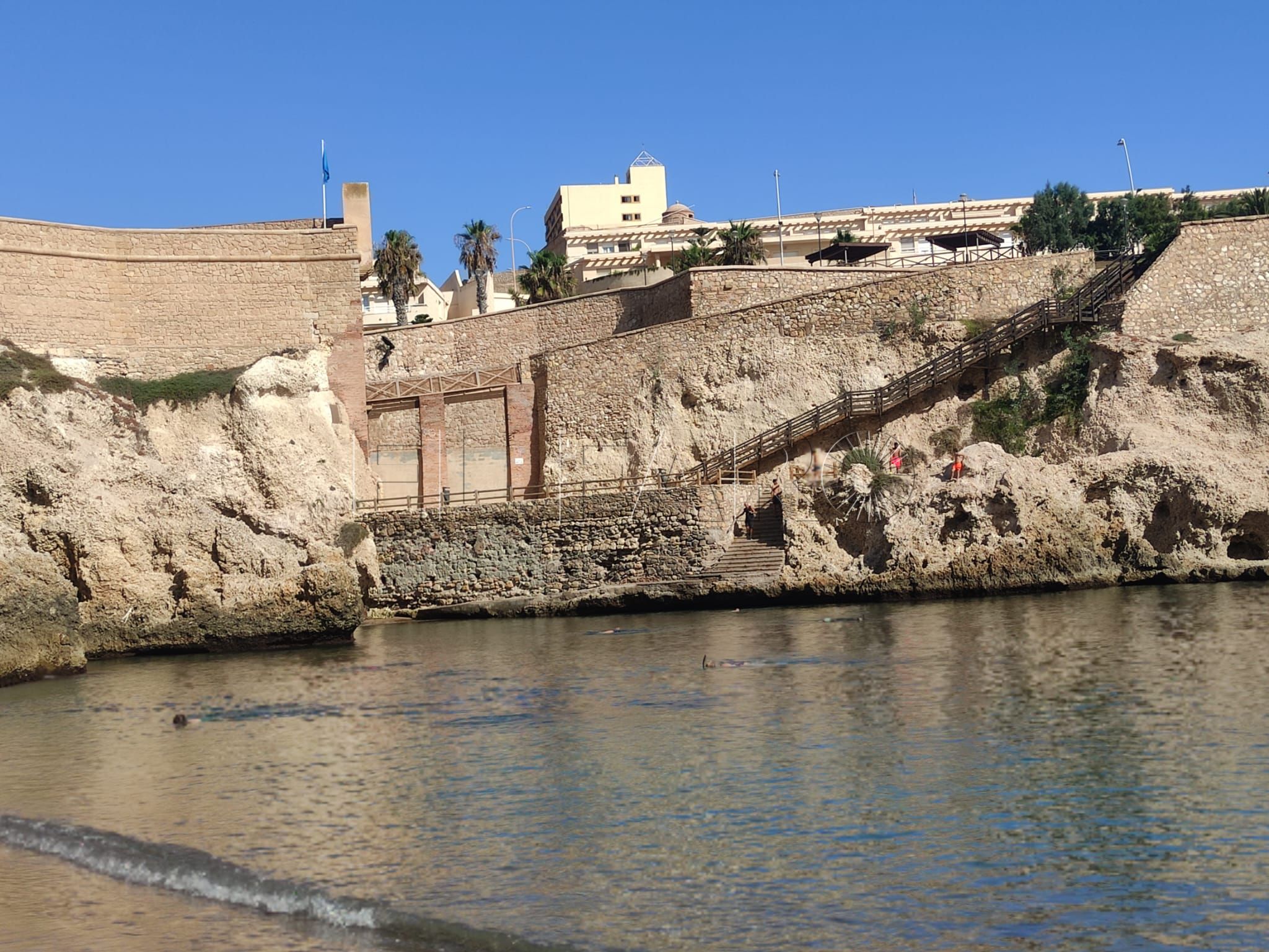 La puerta parece cerrada, pero dos operarios de limpieza vestidos con sus trajes de trabajo naranjas y azules con bandas plateadas, equipados con cubos y herramientas, se disponen a empujarla y abrir la ovalada puerta de hierro que custodia la Ensenada de los Galápagos. Transcurrir por el camino es ir accediendo poco a poco a una zona privilegiada. Una cala de 200 metros de longitud que permite vislumbrar el mar abierto a lo lejos y adentrarse en las aguas templadas del Mediterráneo. Un entorno natural singularmente bello y acogedor, escondido bajo las murallas de la ciudadela y abrazado por montañas, que melillenses y turistas no dudan en apreciar. En la distancia, se observa a un grupo de 20 buzos sumergidos en el mar y unos jóvenes madrugadores que aprovechando la entrada abierta desde las escaleras de madera de la Alcazaba se disponían a darse un chapuzón mañanero.