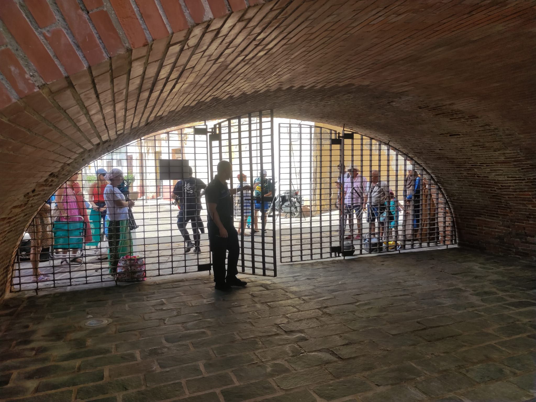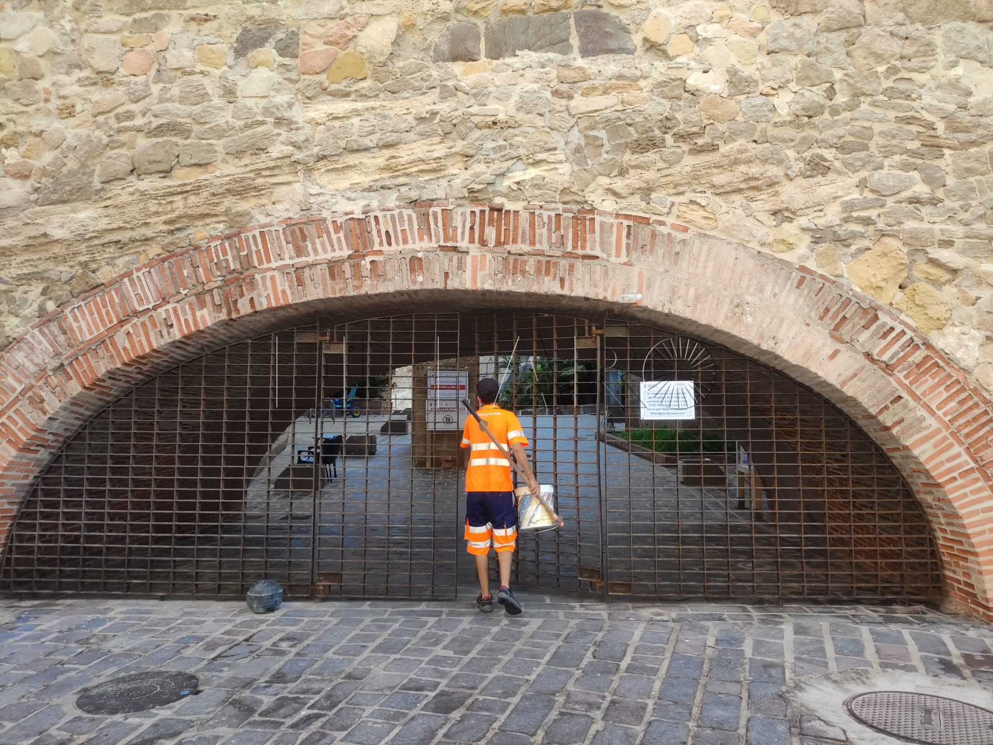 Bajo la fortificación de Melilla la Vieja, dejando atrás el bote en recuerdo del pasado marinero de la ciudad, se observa la puerta custodiada que da paso al Foso de Santiago. En ella se aprecia un cartel que comunica a los usuarios que la playa permanecerá cerrada hasta las 11.30 horas por labores de logística y pide disculpas por las molestias ocasionadas a los vecinos.