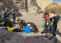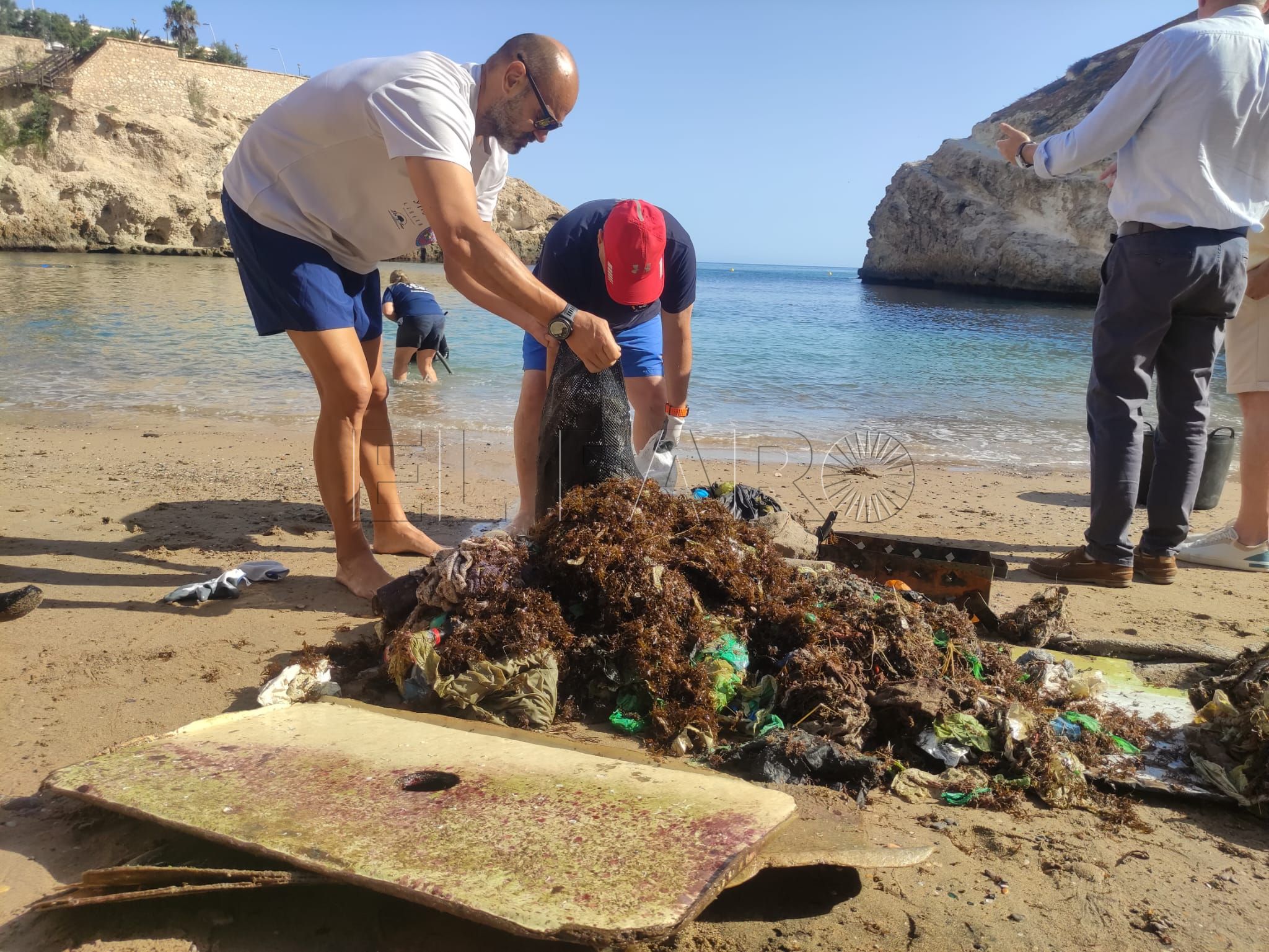 Mientras los buzos avanzaban en abanico y recogían manualmente los desechos del fondo del mar; a lo lejos, el barco de la limpiamar apoyaba la labor de extracción en la salida del acantilado y facilitaba el trabajo de sus compañeros que también se acercaban para entregarle algunos de los restos que iban encontrando en inmersión como sillas de playa. Poco a poco, el bote se aproxima a la orilla y los voluntarios salen del agua con sus trajes de neopreno, aletas y botellas de aire a la espalda.