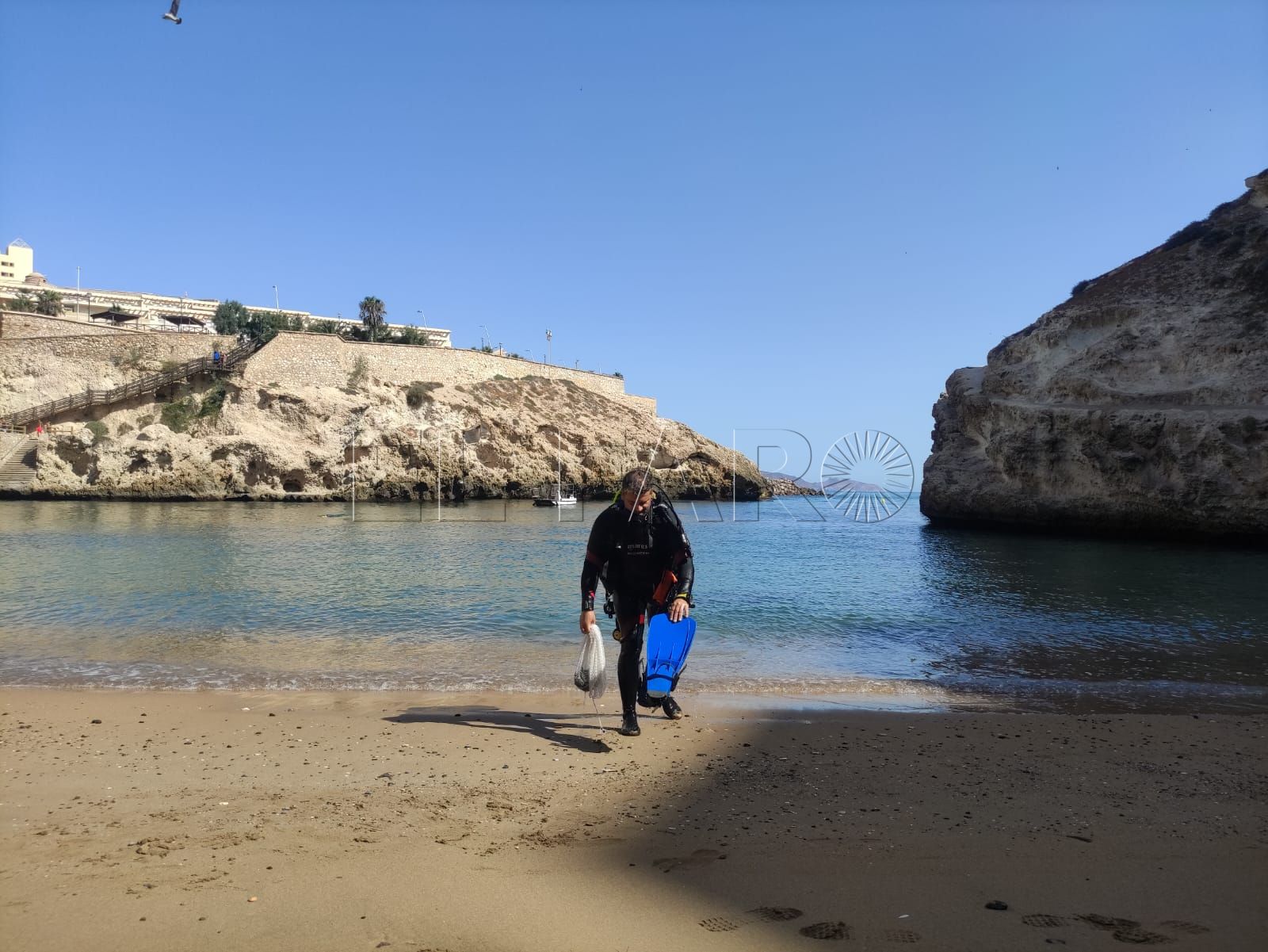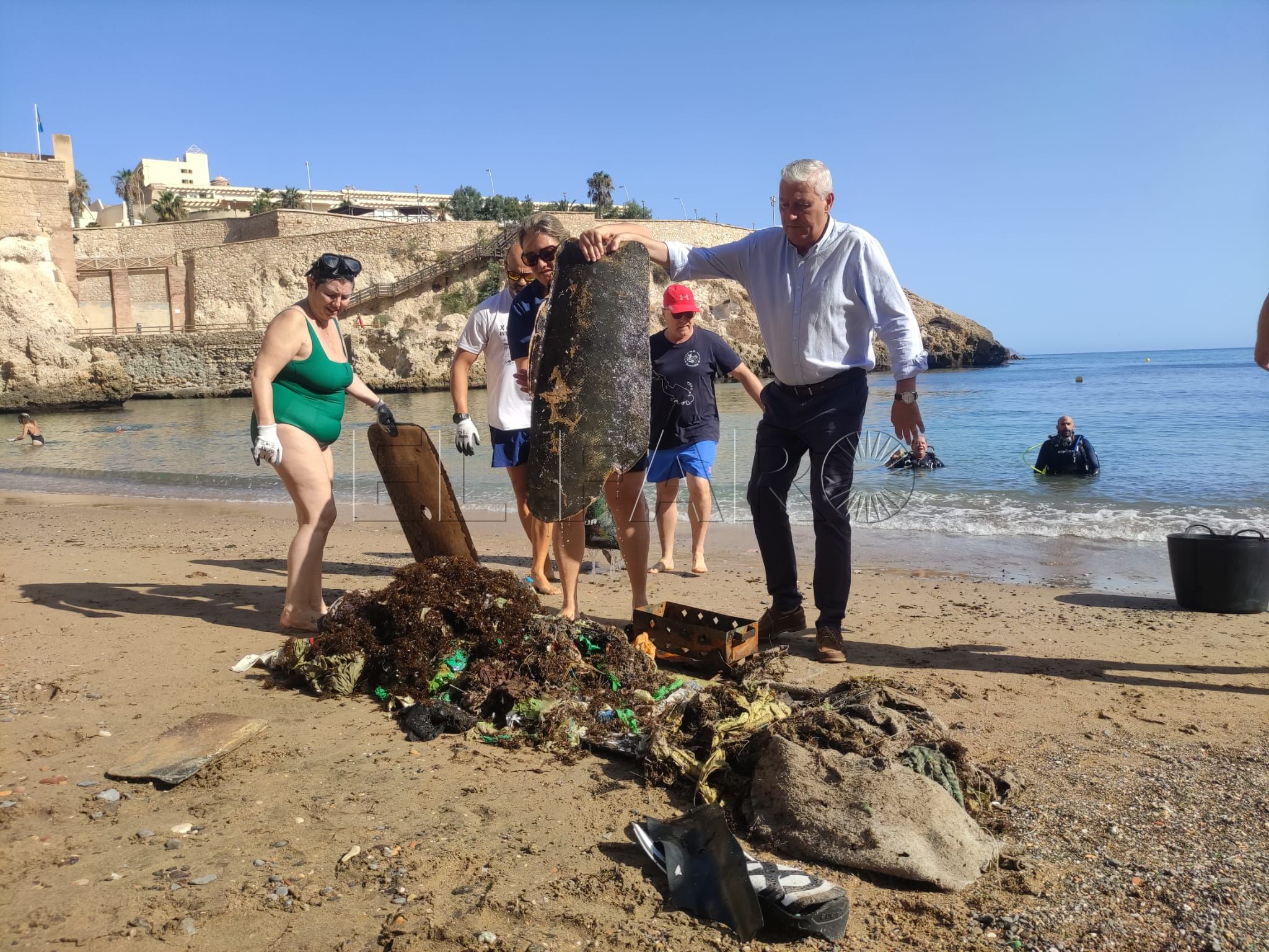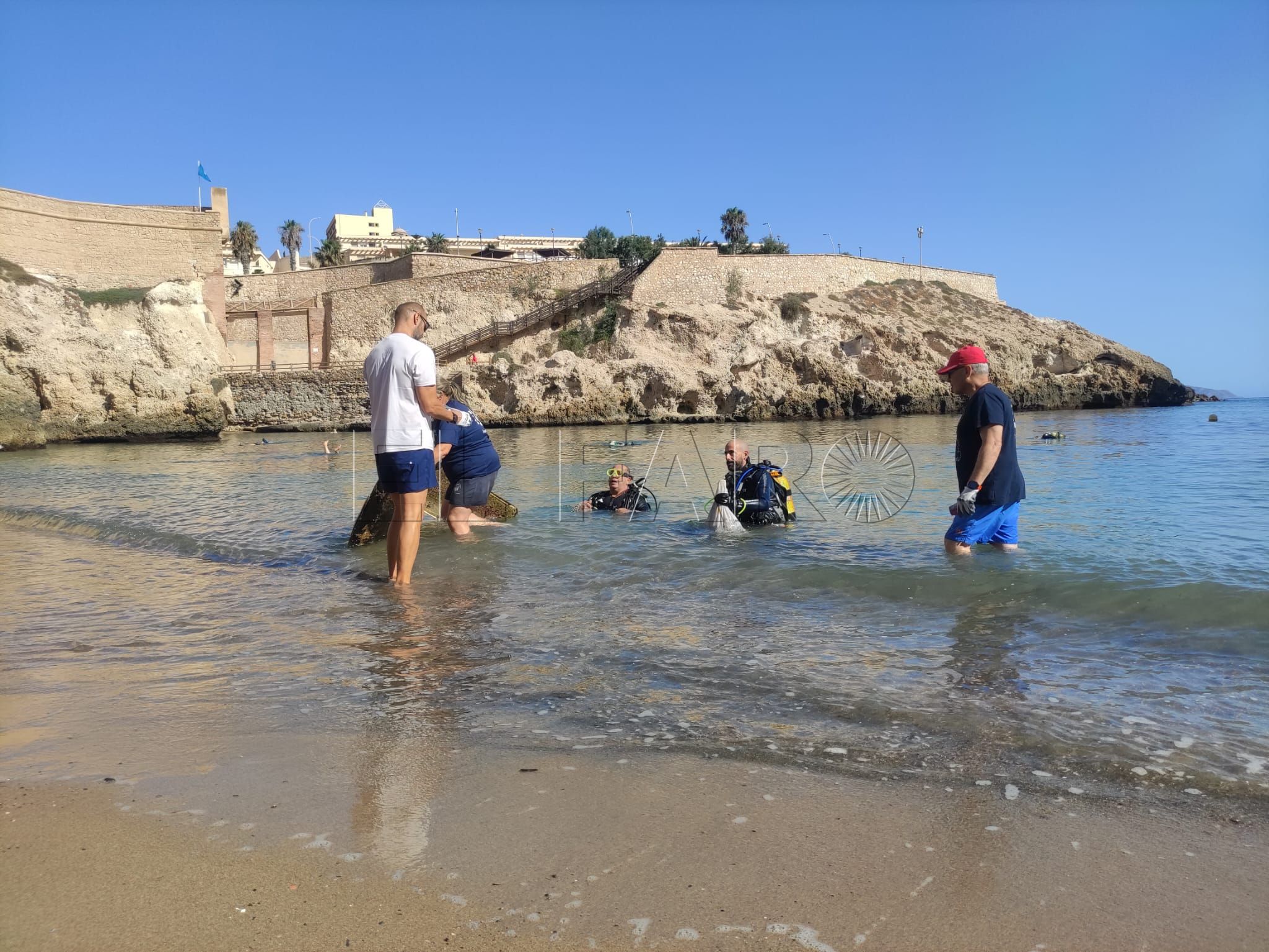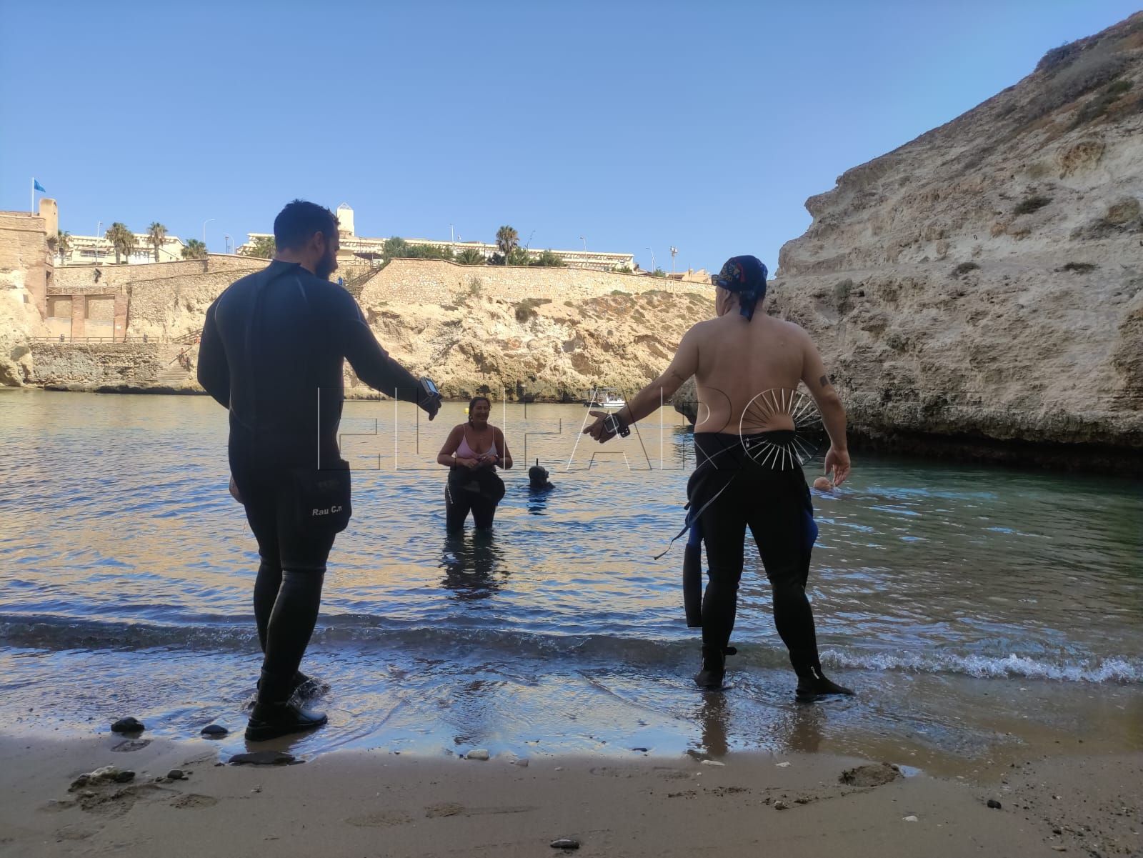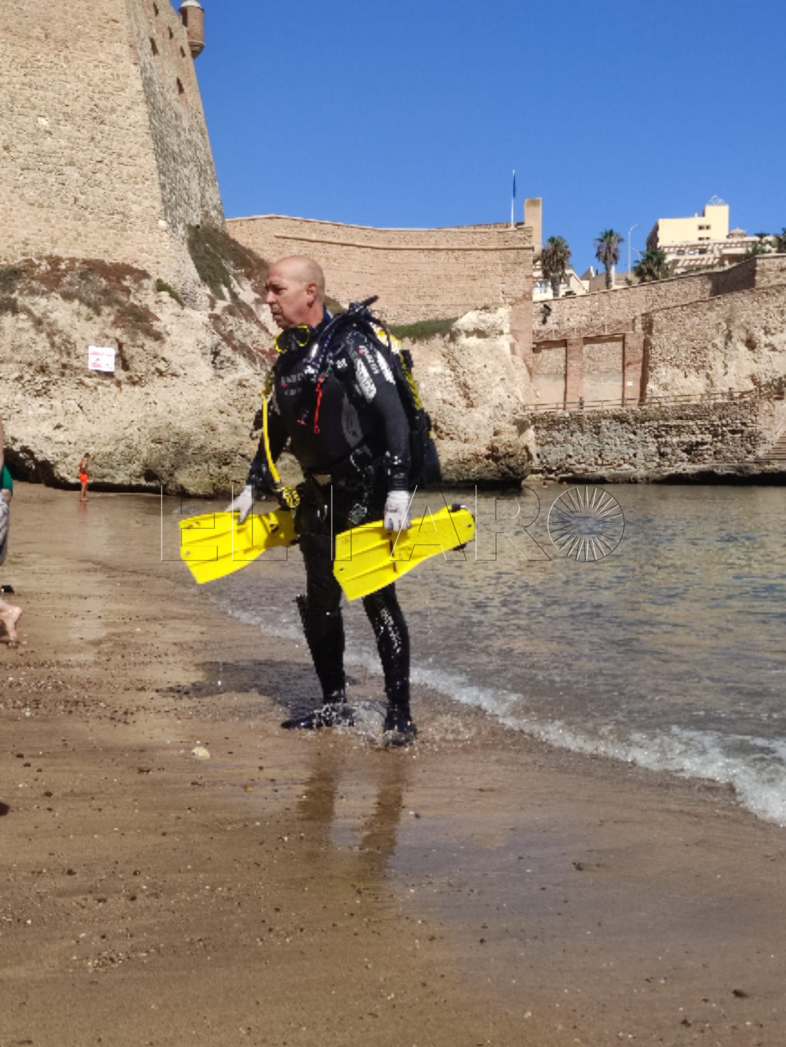 Hora y media de diferencia con el resto de días de acceso al baño desde el Foso de Santiago y algo más de dos horas de trabajo de inmersión han facilitado que el fondo marino pueda hoy estar un poco más limpio. Este trastoque horario, que a algunos melillenses les ha pillado por sorpresa, ha permitido el saneamiento extra de la pequeña cala en una iniciativa propiciada por la Asociación Buceomelilla y la consejería de Deporte, con el apoyo de Medio Ambiente.