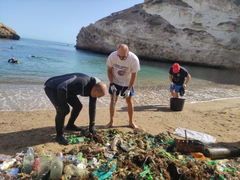 Mientras los buzos avanzaban en abanico y recogían manualmente los desechos del fondo del mar; a lo lejos, el barco de la limpiamar apoyaba la labor de extracción en la salida del acantilado y facilitaba el trabajo de sus compañeros que también se acercaban para entregarle algunos de los restos que iban encontrando en inmersión como sillas de playa. Poco a poco, el bote se aproxima a la orilla y los voluntarios salen del agua con sus trajes de neopreno, aletas y botellas de aire a la espalda.