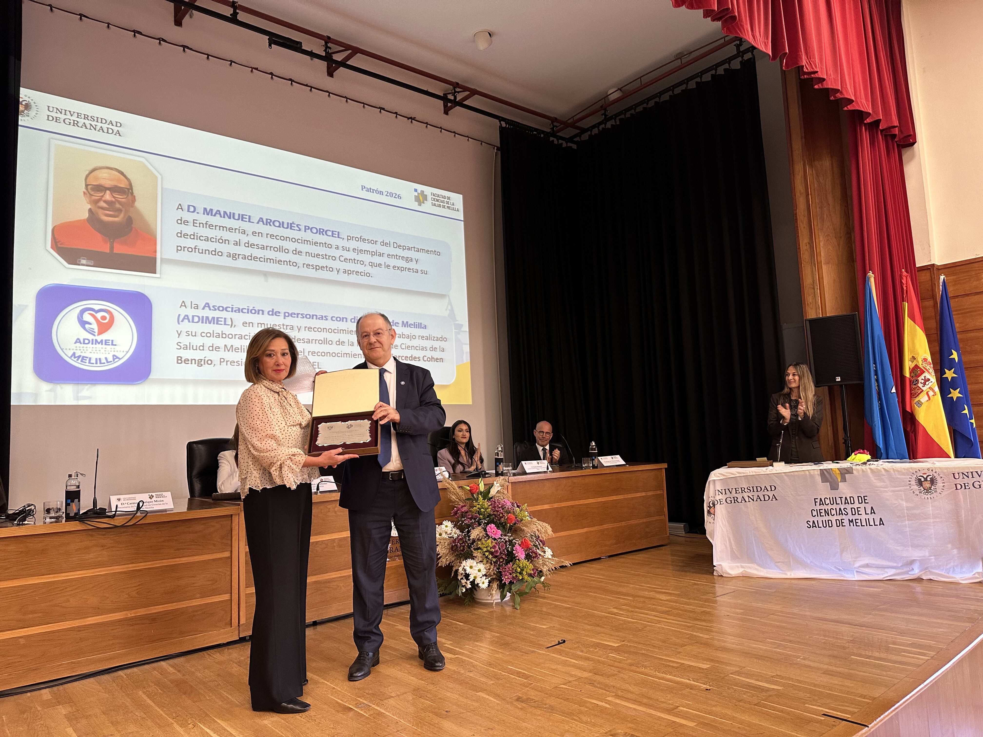 Se ha dedicado un emotivo instante al personal jubilado del campus: Dña. Esperanza Romero Estudillo del departamento de Enfermería (PDI) y Amelia Lozano Moreno (Ptgas). Después, se ha puesto en valor el papel del profesor de Enfermería D. Manuel Arqués Porcel por su gran aportación a la Facultad, y a la Asociación de Personas con Diabetes de Melilla (Adimel) por su inigualable labor en la ciudad, llamando a su presidenta Dña. Mercedes Cohen a recoger el galardón.