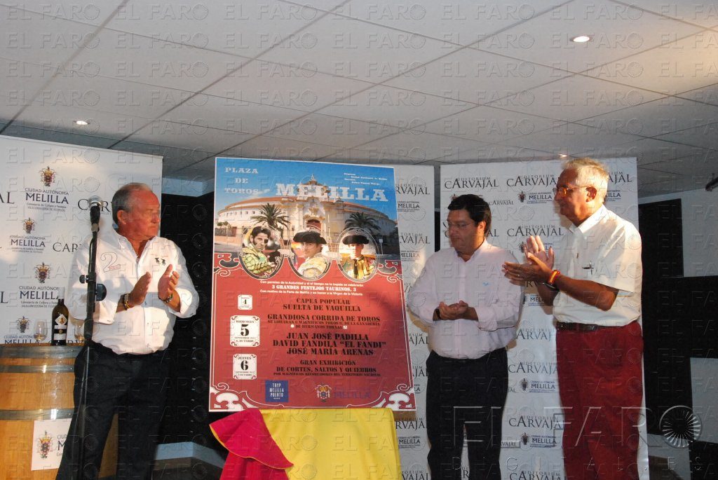 En presencia del presidente de la Ciudad, Juan José Imbroda, el viceconsejero de Festejos, Francisco Díaz, los responsables de la organización de los festejos taurinos, Antonio Gutiérrez y Pedro Venzal, descubrieron el cartel de toros de este año acompañados de los aplausos de los asistentes. Este acto tuvo lugar en los locales del Auditorio Carvajal, donde los presentes pudieron disfrutar momentos después de un ágape.