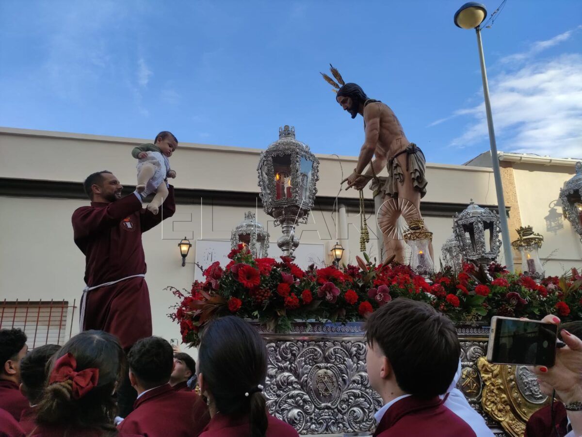 Pero antes, un instante de intimidad compartida. Las familias se acercaron con sus bebés en brazos. Uno a uno, los pequeños fueron elevados por encima de los portadores, suspendidos por un momento frente a la mirada de Jesús. Un gesto sencillo, cargado de fe, que se repetía entre murmullos y emoción contenida. Superado ese momento, el trono emprendió su camino, alejándose lentamente de la Casa Hermandad. Tras él, el ritual volvía a comenzar.