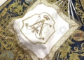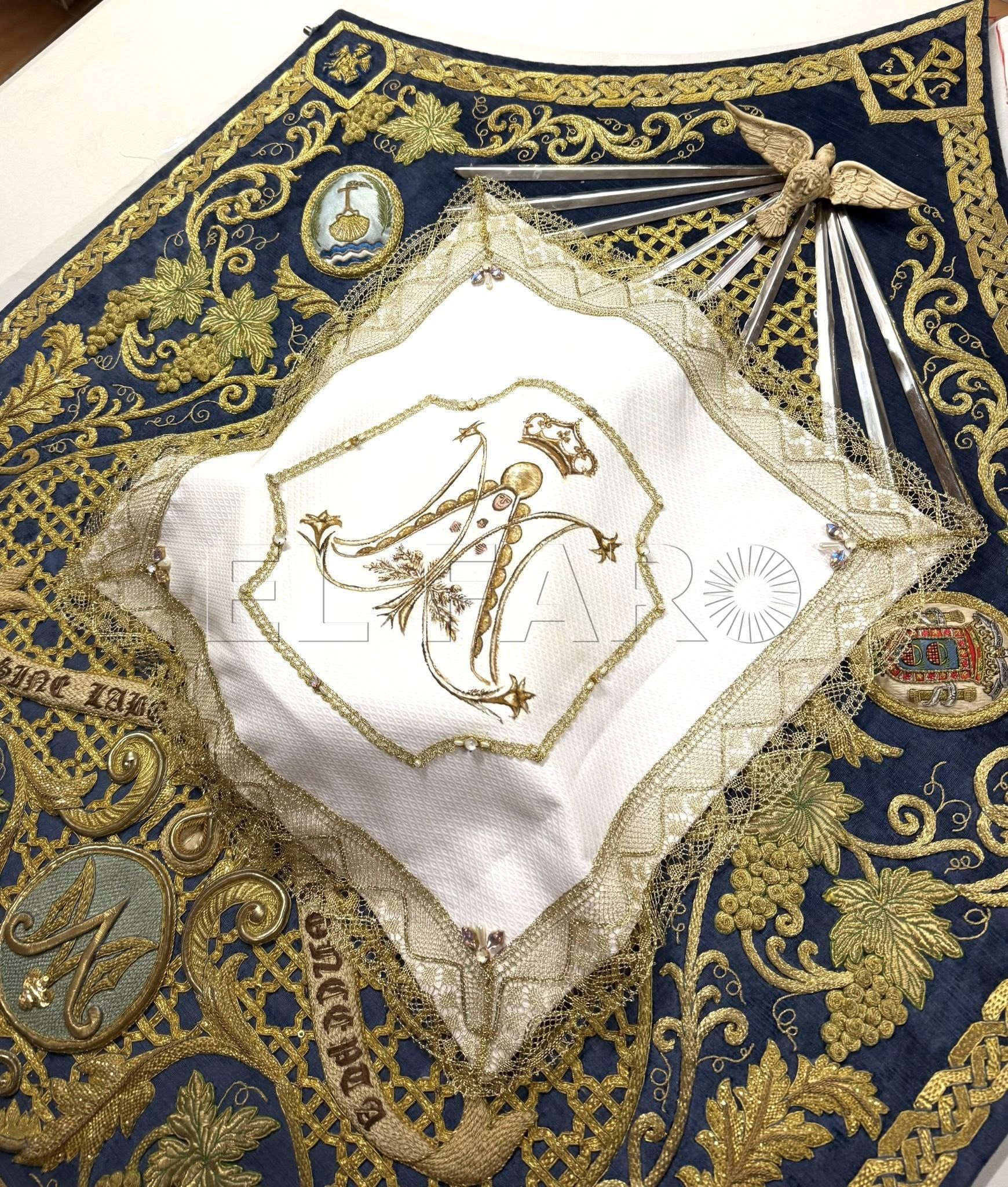Al día siguiente, la Hermandad presentó este pañito ya colocado sobre la Virgen del Simpecado, una delicada obra donada por José Pedro Cobreros e Isabel Aviñón, y enriquecida con una aportación pictórica que representa a María en el interior del anagrama mariano, rodeada de vegetación asociada a su advocación.