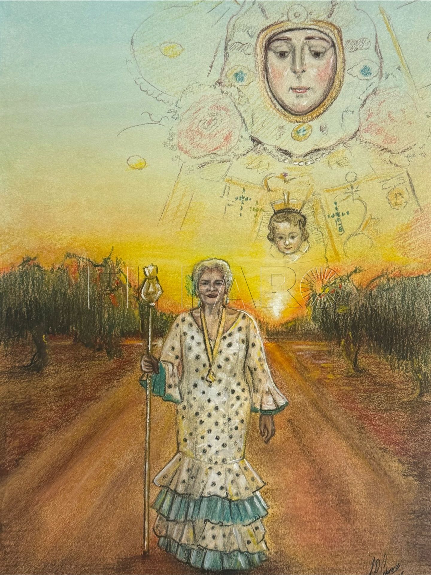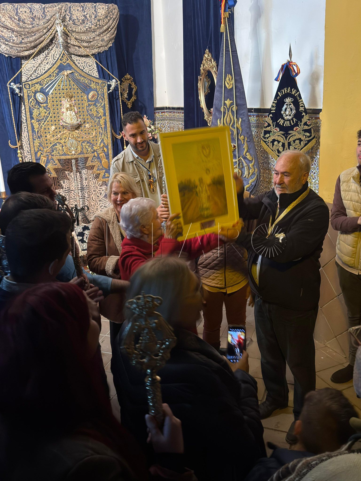 Se le entrego un cuadro a la hermana mayor honoraria que representa a Antonia en el camino del Rocío, acompañada por los símbolos que han marcado su vida rociera. "Su rostro sereno, la medalla de hermana mayor que portó con orgullo y responsabilidad, y, presidiéndolo todo, la Santísima Virgen del Rocío y el Divino Pastorcito, que la miran y la guían, como faro y amparo constante, en ese camino que ella misma ha enseñado a recorrer a tantas generaciones de hermanos", declararon desde la hermandad.
