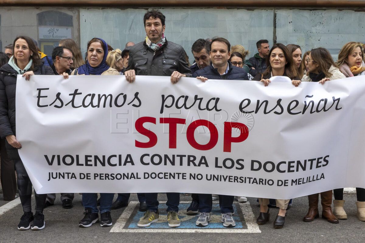MELILLA, 04/03/2026.- Un centenar y medio de profesores se concentran este miércoles frente a la Dirección Provincial del Ministerio de Educación en Melilla para exigir respeto hacia ellos y a la convivencia en los centros educativos, en cuyos entornos han pedido presencia policial después de que se hayan producido varios casos de agresiones contra profesores. Un centenar y medio de profesores se han concentrado este miércoles para exigir respeto hacia ellos y a la convivencia en los centros educativos, en cuyos entornos han pedido presencia policial después de que se hayan producido varios casos de agresiones contra profesores. EFE/ Giner