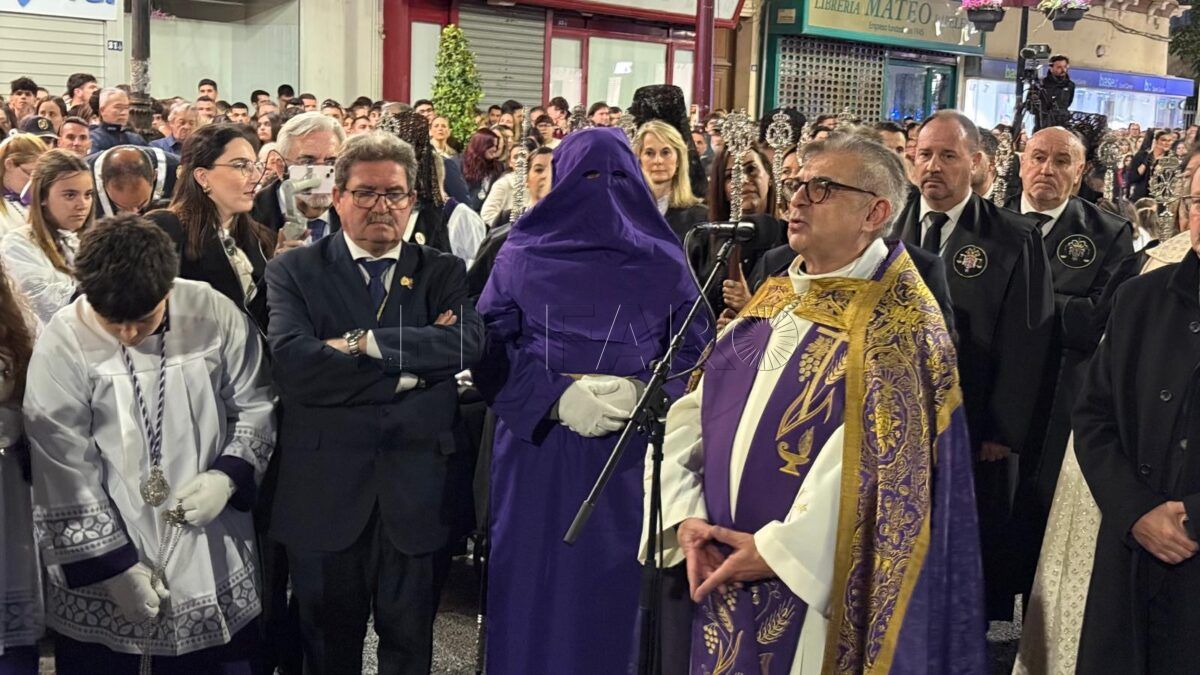 A su paso por la carrera oficial, antes de llegar a la Tribuna, Nuestro Padre Jesús Cautivo de Medinaceli y María Santísima del Rocío se aliaron para avanzar juntos. Así, paso a paso y acompañados por la banda de la cofradía, ambos realizaron una parada frente a representantes públicos, miembros de los cuerpos de seguridad y el vicario Eduardo Resa.