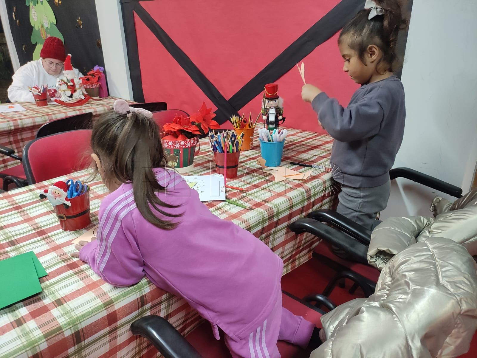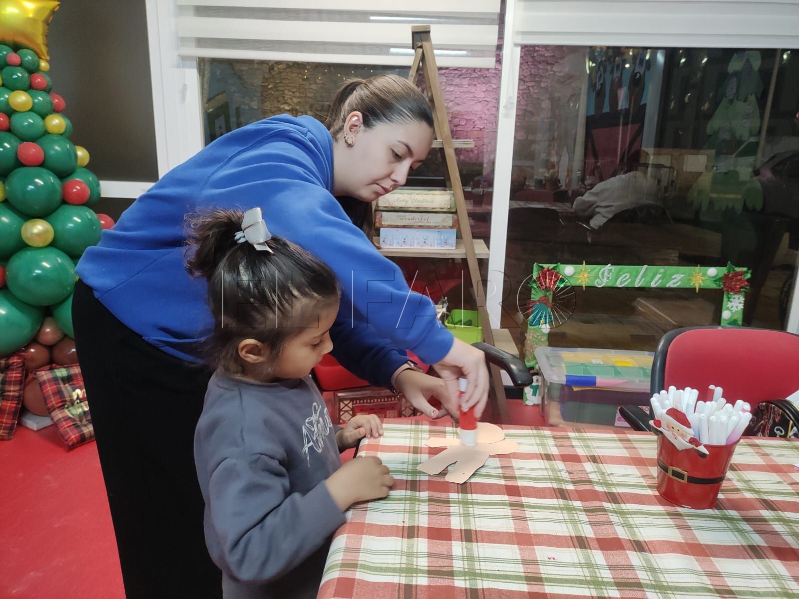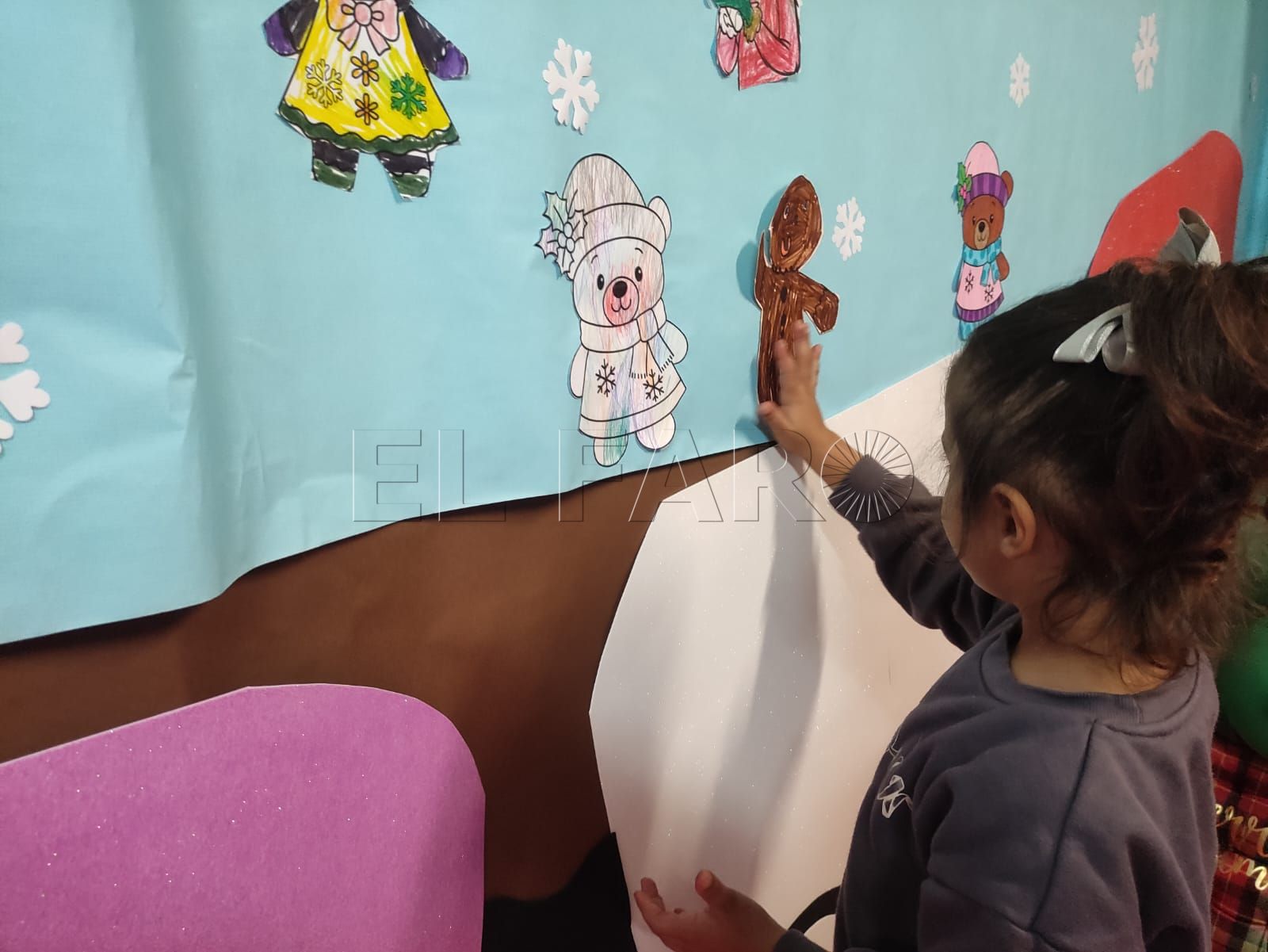 Algo que nunca falla, además de los papeles con dibujos impresos que suelen reclamar constantemente los pequeños y que, incluso dejan en el espacio para finalizar en otro momento, es el fotocall navideño, lleno de gorros de Papá Noel, cuernos de reno y accesorios divertidos. “Lo decoró una compañera y ha quedado precioso. Está todo lleno de brillo, como nos gusta”, cuenta Julia, orgullosa del resultado y resaltando el entretenimiento y el recuerdo que supone para las participantes el recuerdo fotográfico.
