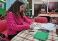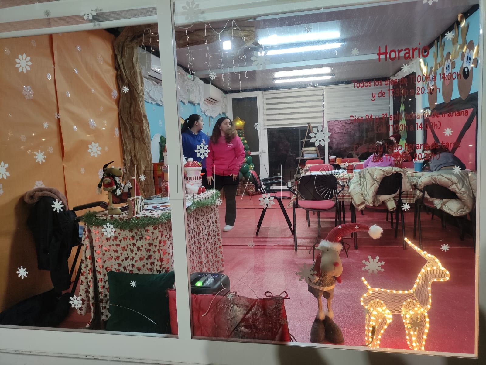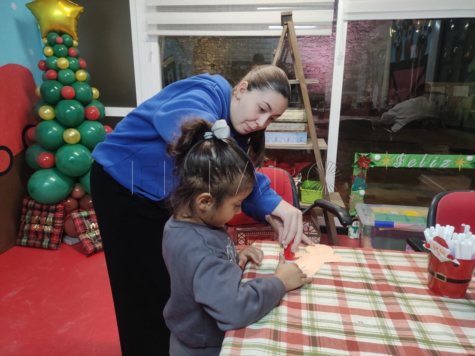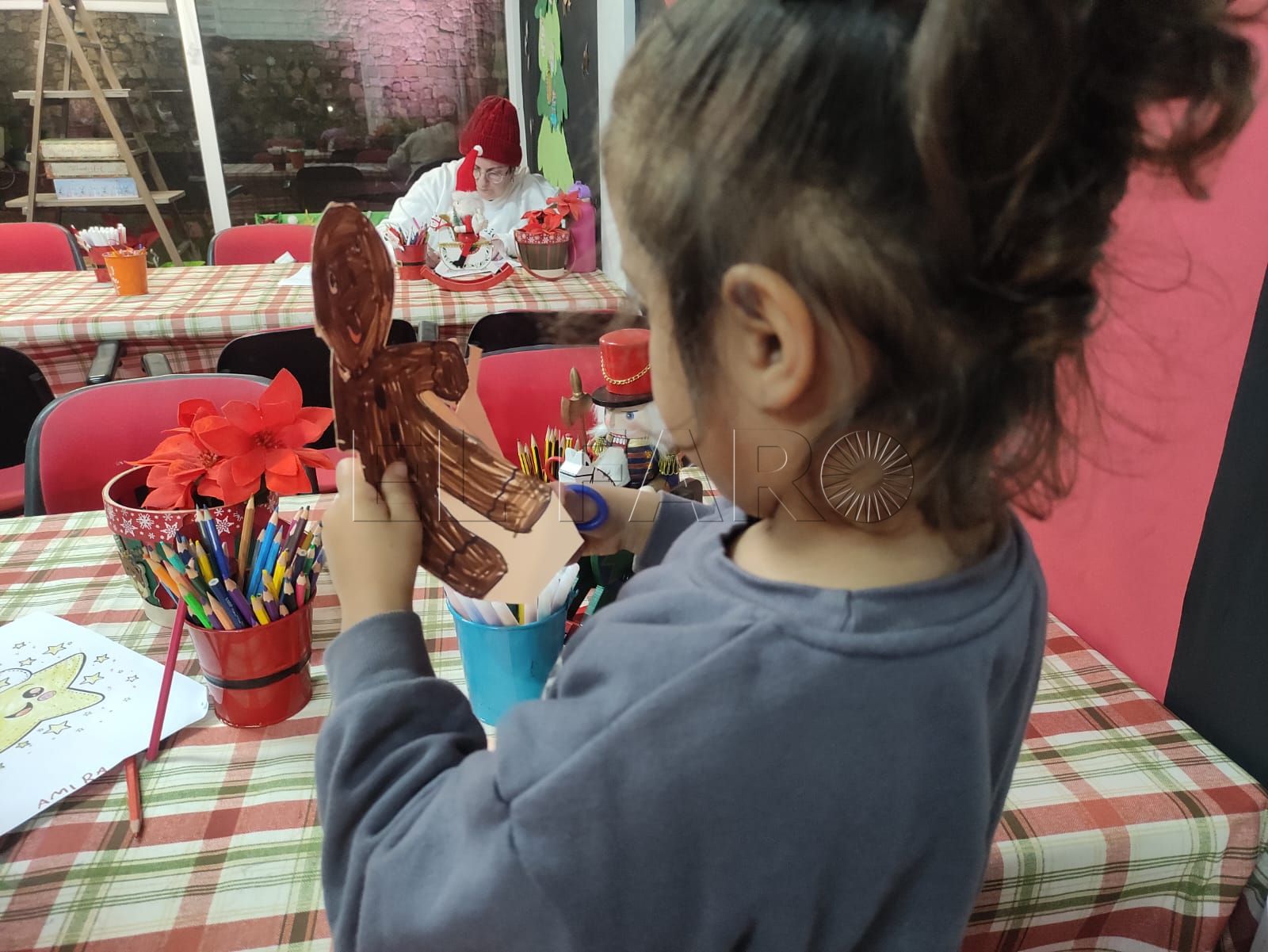 Algo que nunca falla, además de los papeles con dibujos impresos que suelen reclamar constantemente los pequeños y que, incluso dejan en el espacio para finalizar en otro momento, es el fotocall navideño, lleno de gorros de Papá Noel, cuernos de reno y accesorios divertidos. “Lo decoró una compañera y ha quedado precioso. Está todo lleno de brillo, como nos gusta”, cuenta Julia, orgullosa del resultado y resaltando el entretenimiento y el recuerdo que supone para las participantes el recuerdo fotográfico.