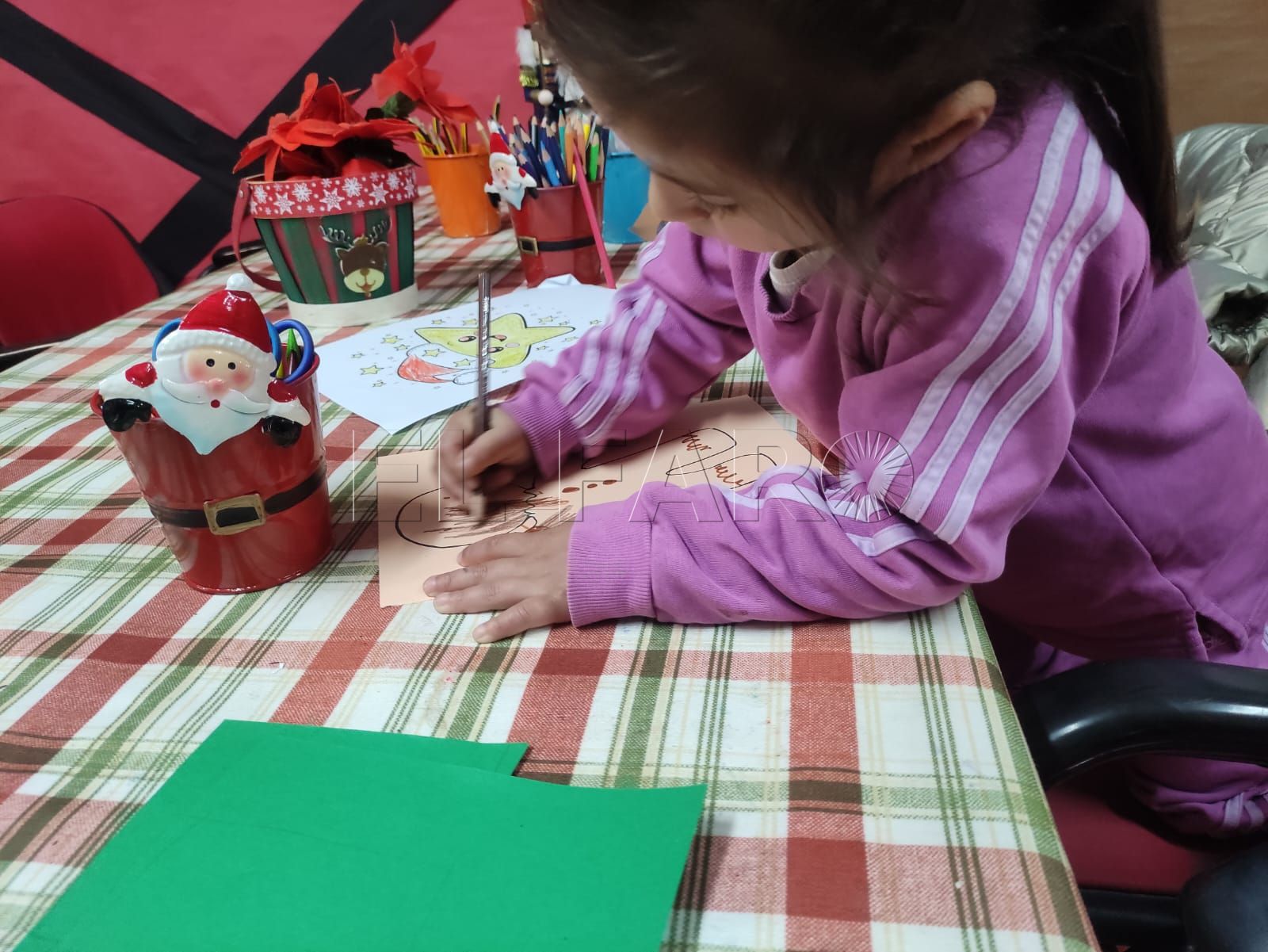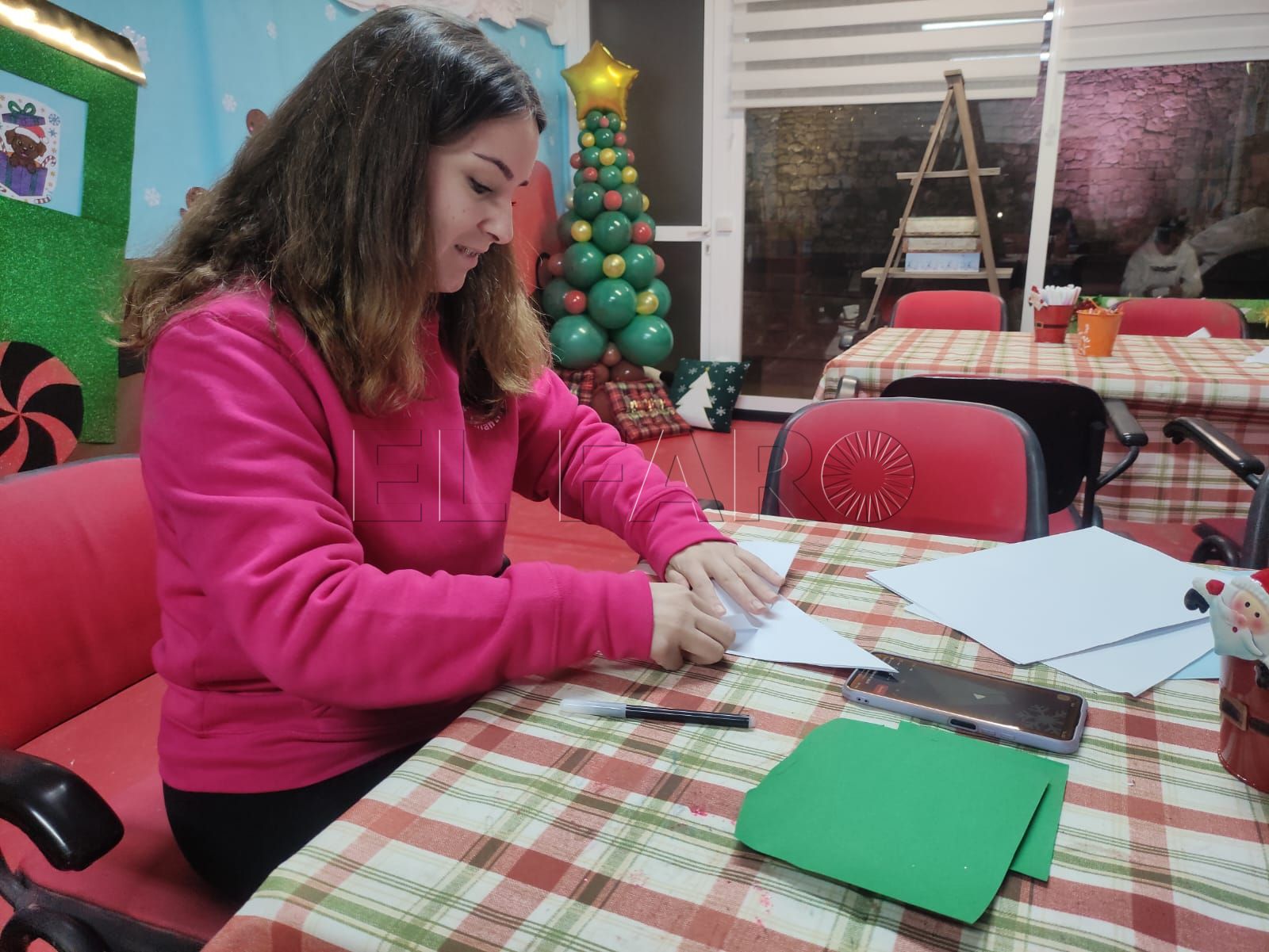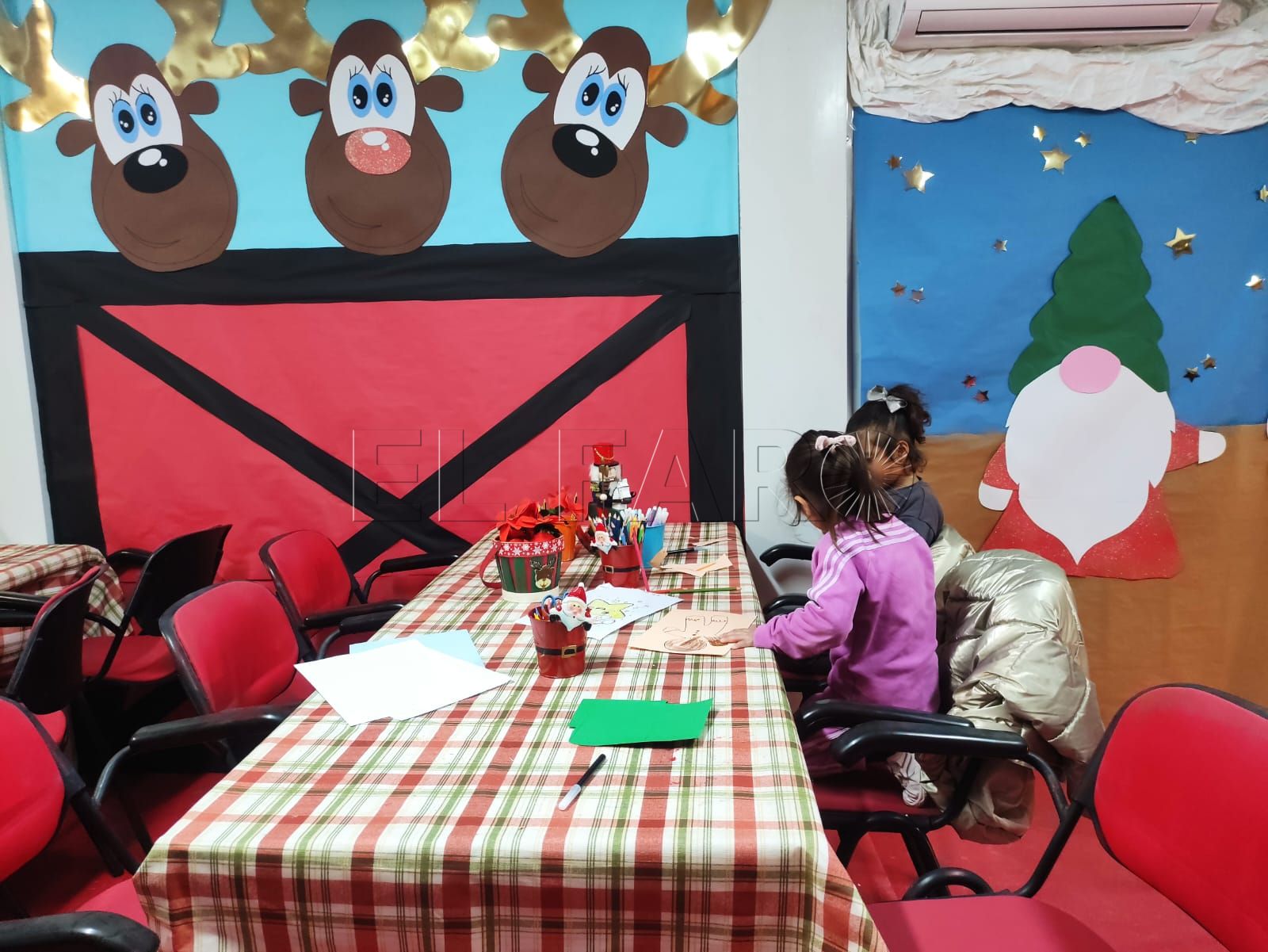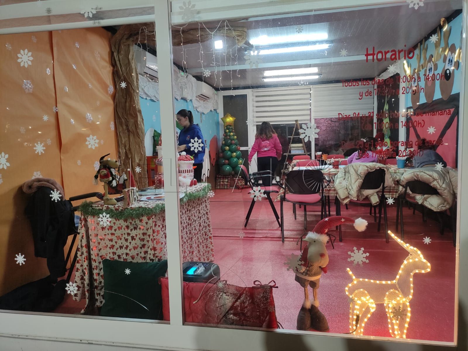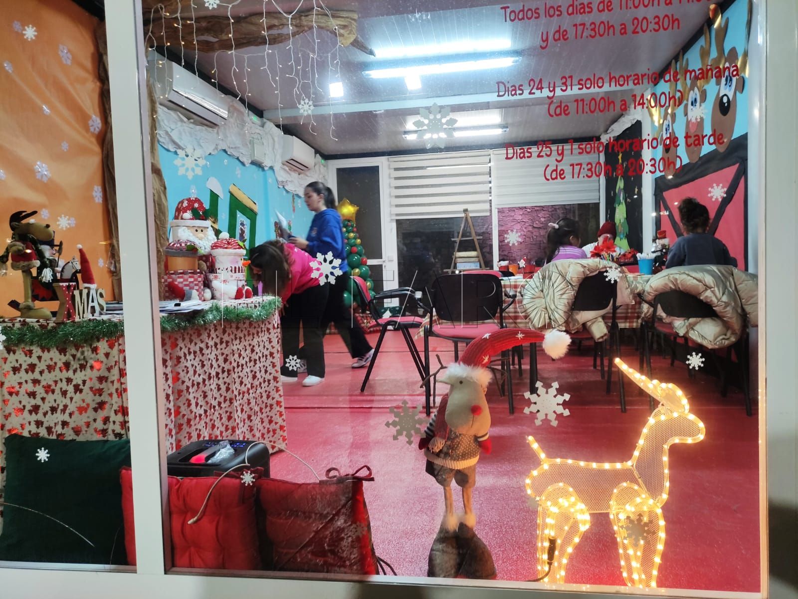 El espacio está decorado con motivos navideños y cuenta con diferentes mesas para dibujar y hacer manualidades, pero también se conciben otras actividades como cuentacuentos o prestar un recuerdo a los pequeños mediante un colorido y brillante fotocall. “Tenemos todo tipo de materiales: goma eva, cartulinas, crayones, tijeras, rotuladores...”, cuenta Julia mientras muestra las cajas repletas y ordenadas. “Los niños hacen de todo y se lo quieren llevar a casa. Se sienten muy orgullosos de lo que hacen, y eso es muy bonito”, sostiene la coordinadora enseñando el decorado de la ludoteca, esperando a seguir incorporando en las paredes las obras creativas de los niños y las niñas que la visitan cada día.
