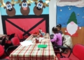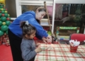 El ambiente en el interior del módulo es cálido y cercano con renos recortados, trenes con muñecos de jengibre esperando a llenar los vagones con obras de arte de los más pequeños, árboles de navidad hechos a partir de globos, recortes de papel con formas de copos de nieve y otros simbolismos que visten este pequeño refugio de color y esencia navideña. Además, la mayoría del equipo está formado por profesionales del ámbito educativo, lo que aporta un valor añadido a la experiencia de los más pequeños, así como a la planificación de actividades. “Somos maestras o estamos estudiando magisterio, también hay técnicas de infantil. Tenemos experiencia y muchas ideas. Aquí nadie se queda mirando el techo”, comenta con humor y cercanía la coordinadora.