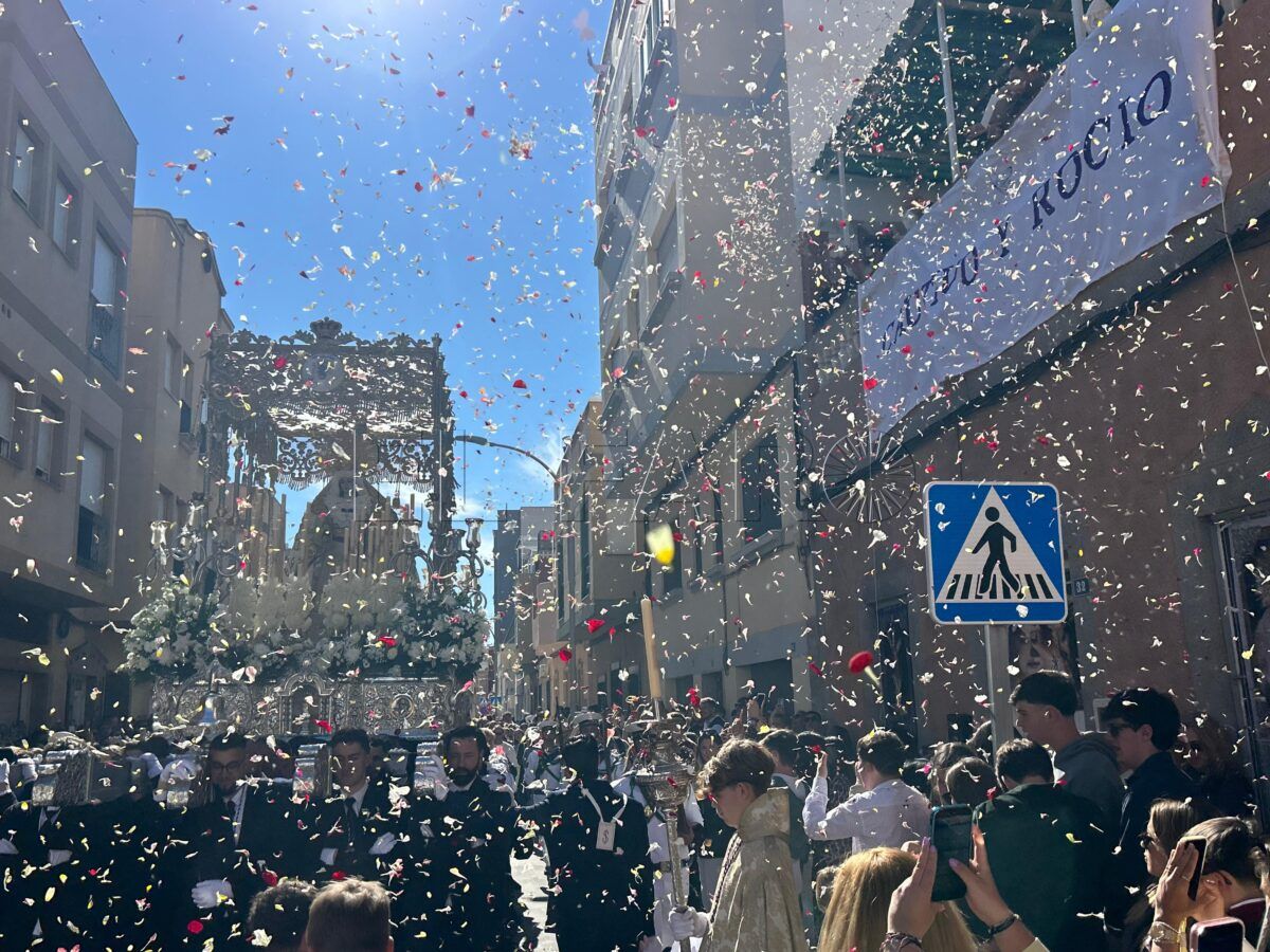 La petalá a los sagrados titulares de la Cofradía de Nuestro Padre Jesús Cautivo de Medinaceli y María Santísima del Rocío se convirtió, en la tarde del Jueves Santo, en uno de los momentos más emotivos del discurrir procesional. Sobre las 17:00 horas, los pétalos blancos y rojos preparados durante la jornada previa comenzaron a desplegarse desde uno de los puntos habituales del recorrido, envolviendo a las imágenes en una lluvia floral preciosa.
