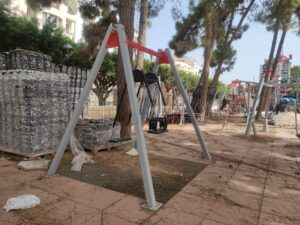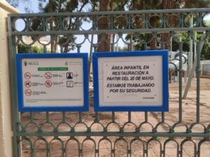 En la puerta del recinto, un cartel anuncia "área infantil en restauración a partir del 20 de mayo. Estamos trabajando por su seguridad". Las obras, que estaban previstas finalizar durante el mes de septiembre, se han alargado en el tiempo. En el interior se aprecian los diferentes columpios ya levantados en su totalidad, sin embargo, quedan detalles por culminar.
