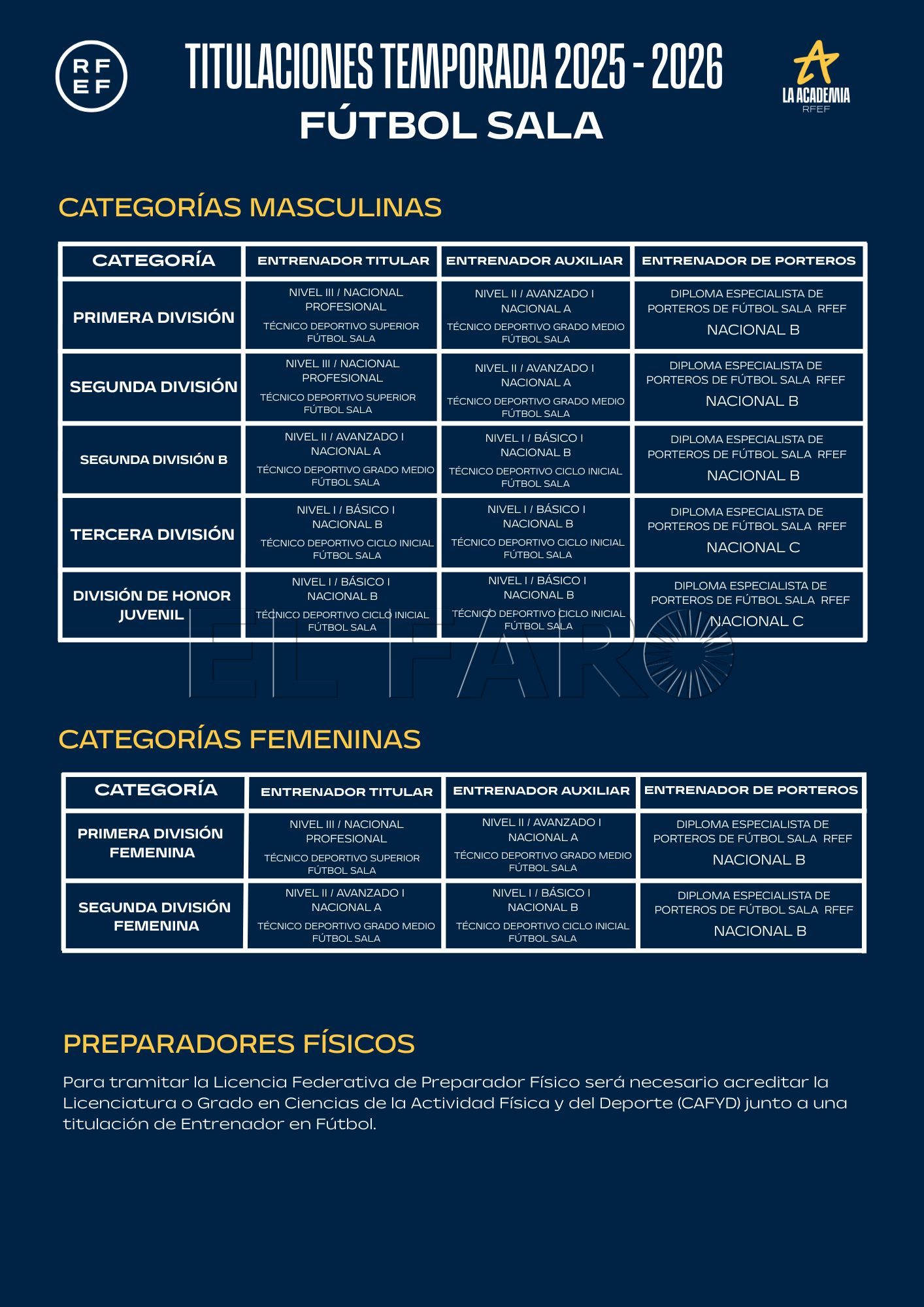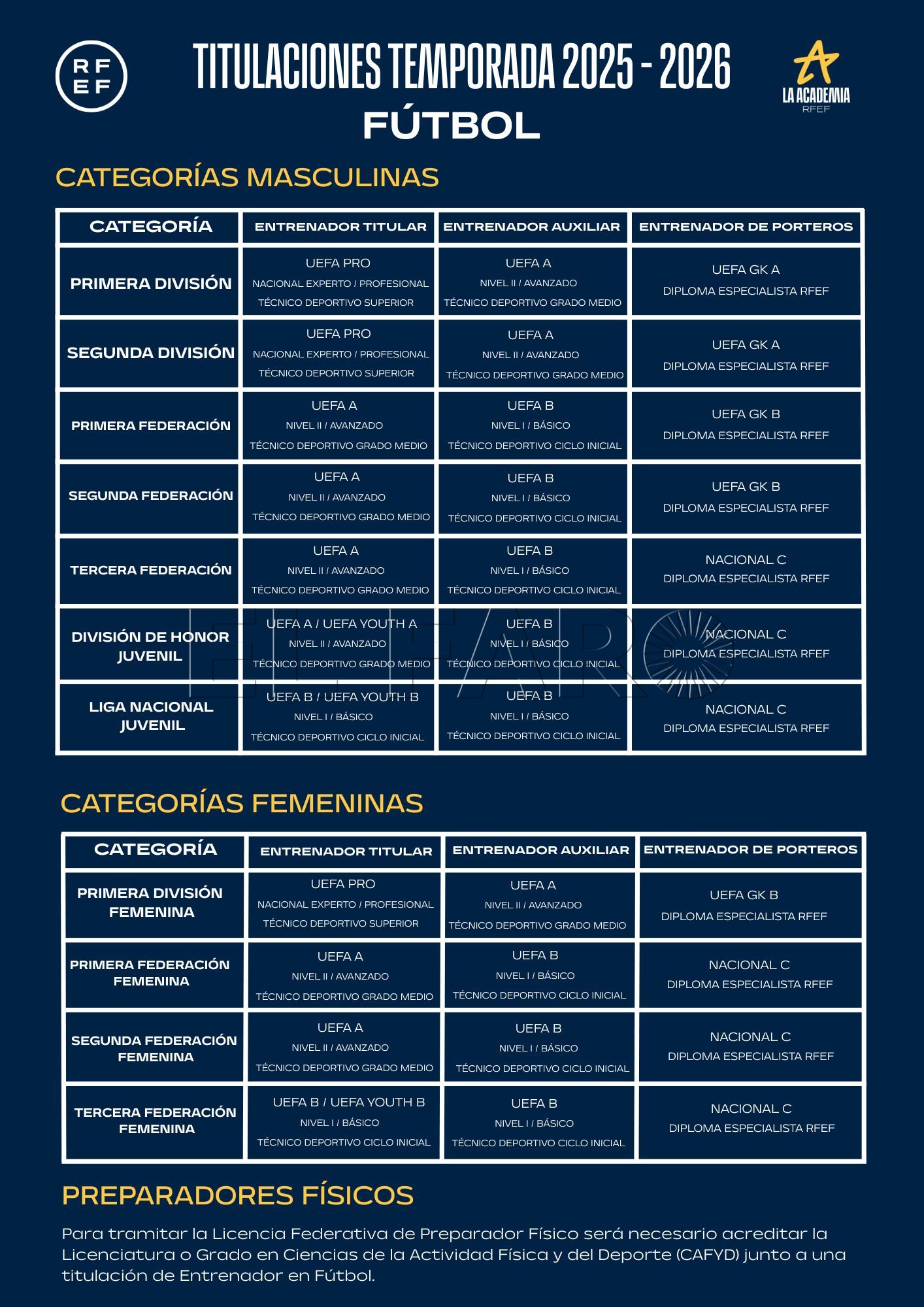 A continuación, recordamos las titulaciones necesarias para entrenar a equipos de Fútbol y Fútbol Sala, tanto masculinos como femeninos, en las competiciones de ámbito nacional durante la temporada 2025-2026.