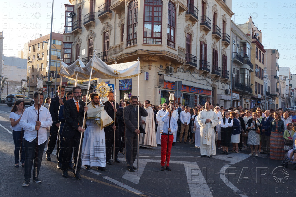 La procesión del Corpus Christi, comenzó en la tarde de ayer, pasadas las 20:00 horas, desde la céntrica Iglesia Sagrado Corazón para recorrer las calles de Melilla y hacer parada en los distintos altares montados para la ocasión.
