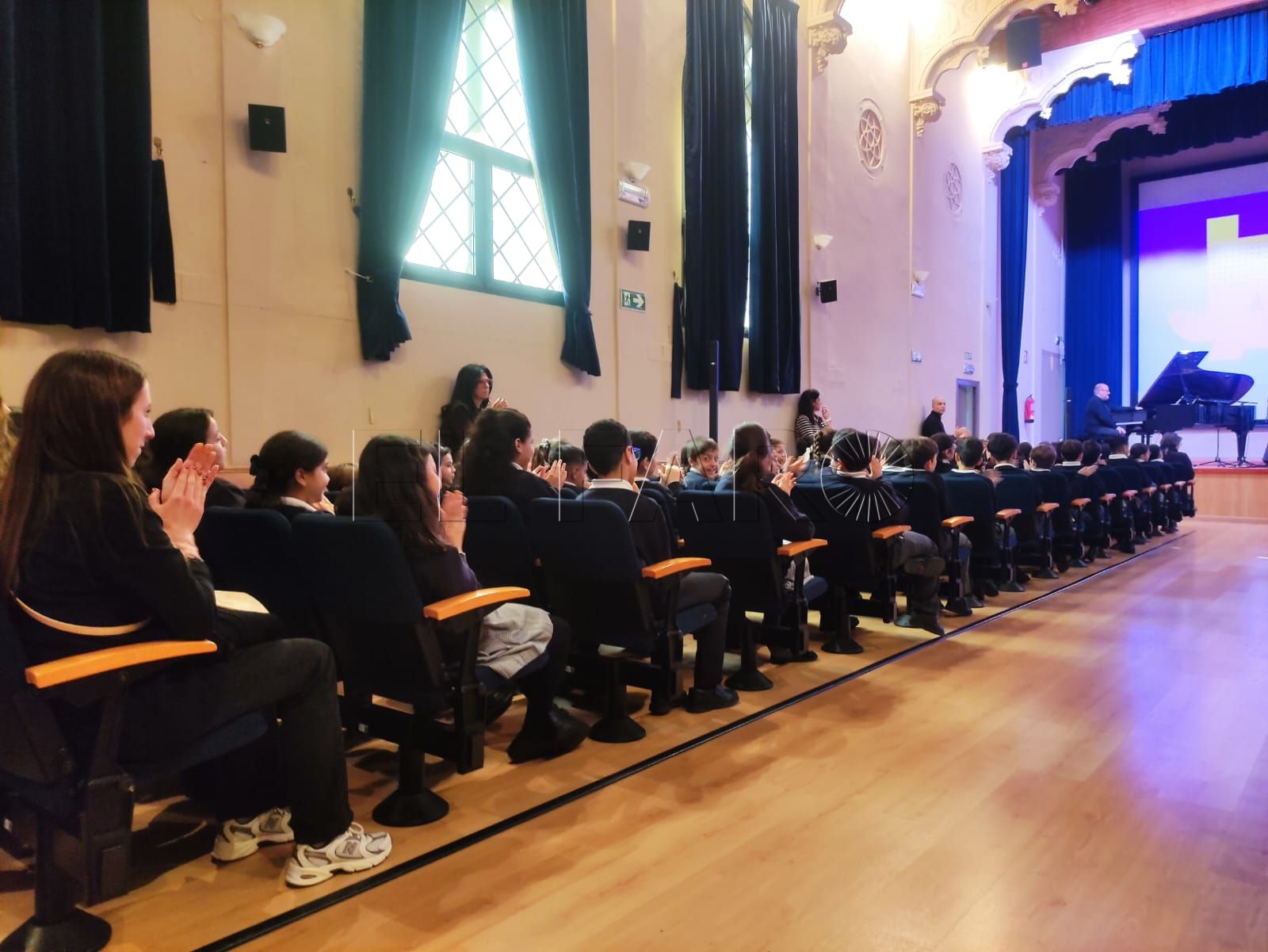 A partir de ese contexto histórico, los músicos fueron desgranando los tres pilares del jazz: melodía, armonía y ritmo. La explicación se hizo cercana y participativa. Cuando se pidió definir qué es una melodía, una alumna levantó la mano para responder, dando pie a que los intérpretes demostraran cómo una misma línea melódica puede transformarse a través de la improvisación, rasgo distintivo del músico de jazz. El piano comenzó marcando una idea, el contrabajo se sumó sosteniendo la base, la batería añadió matices con platillos y caja, y el sonido fue creciendo de forma orgánica.