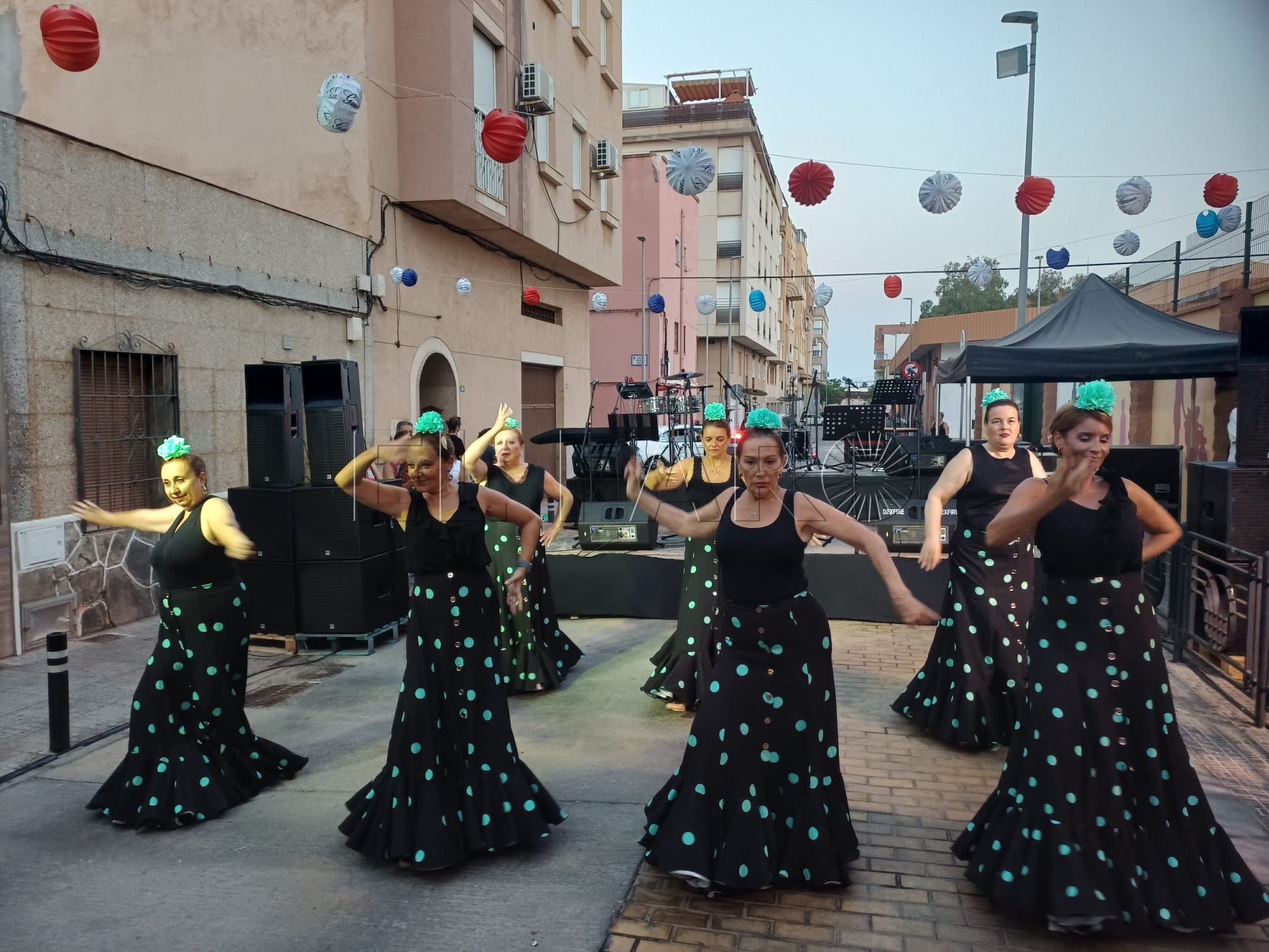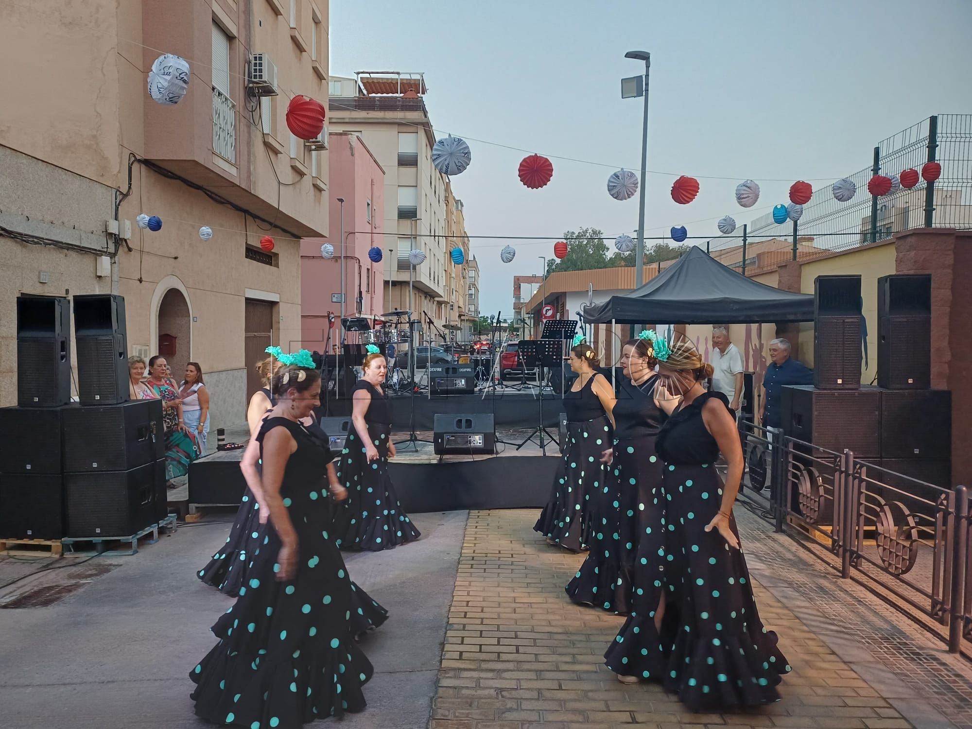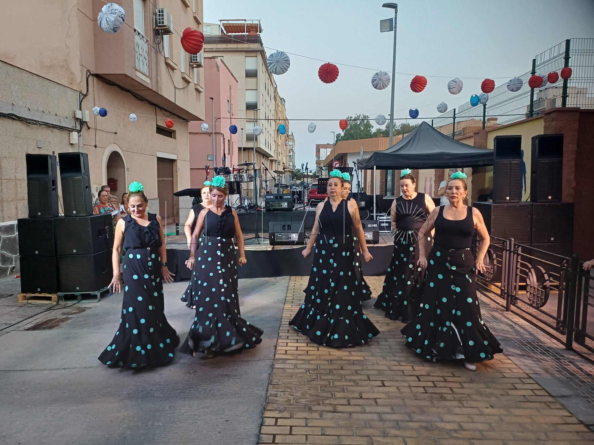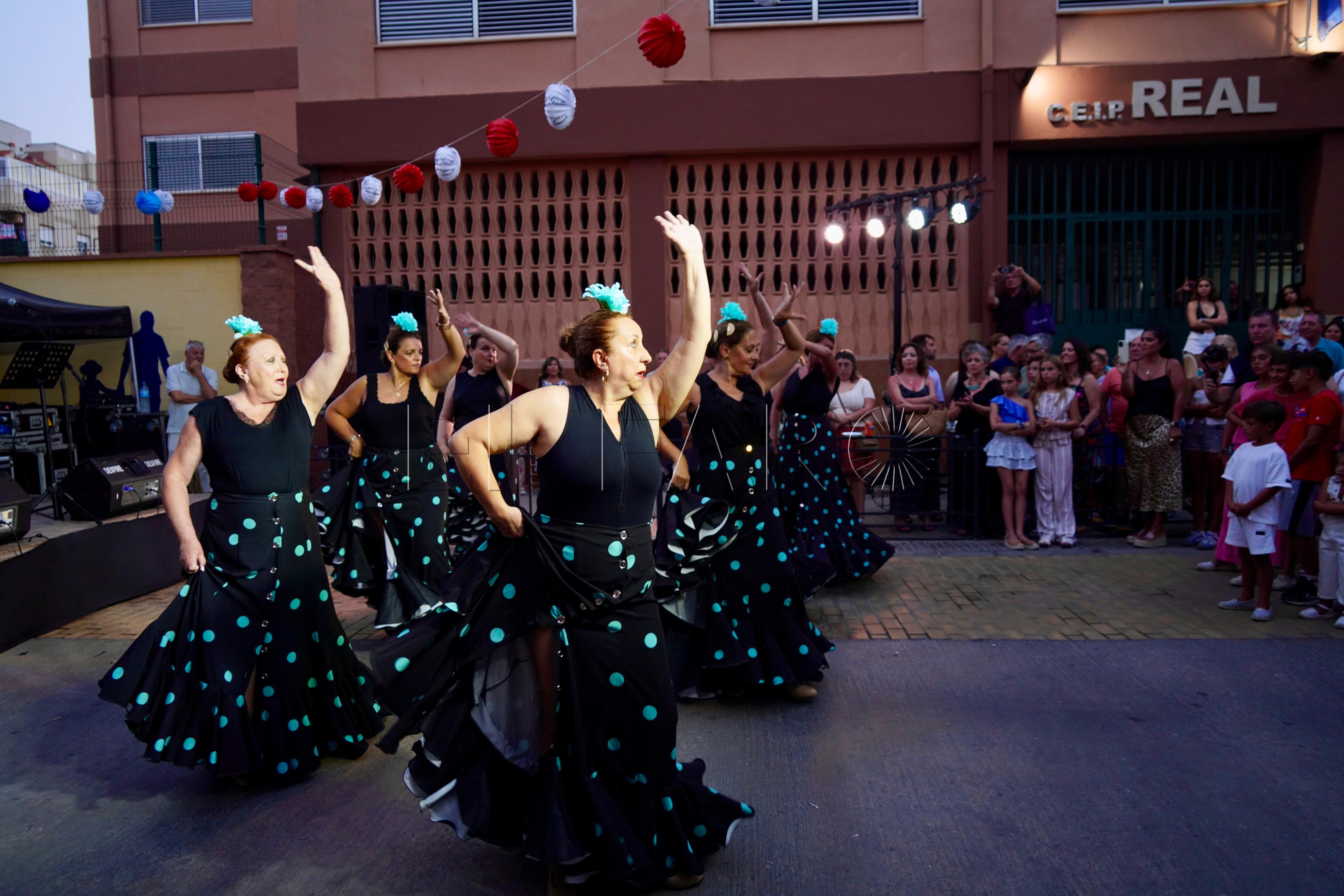 Una vez inaugurada la verbena. Los presentes han sido recibidos por una sesión musical para ambientar el encuentro. Poco antes de las 21:00 horas, le llegó el turno al grupo de baile 'Miénteme', el cual ofreció su actuación aportando ritmo y color a la noche.