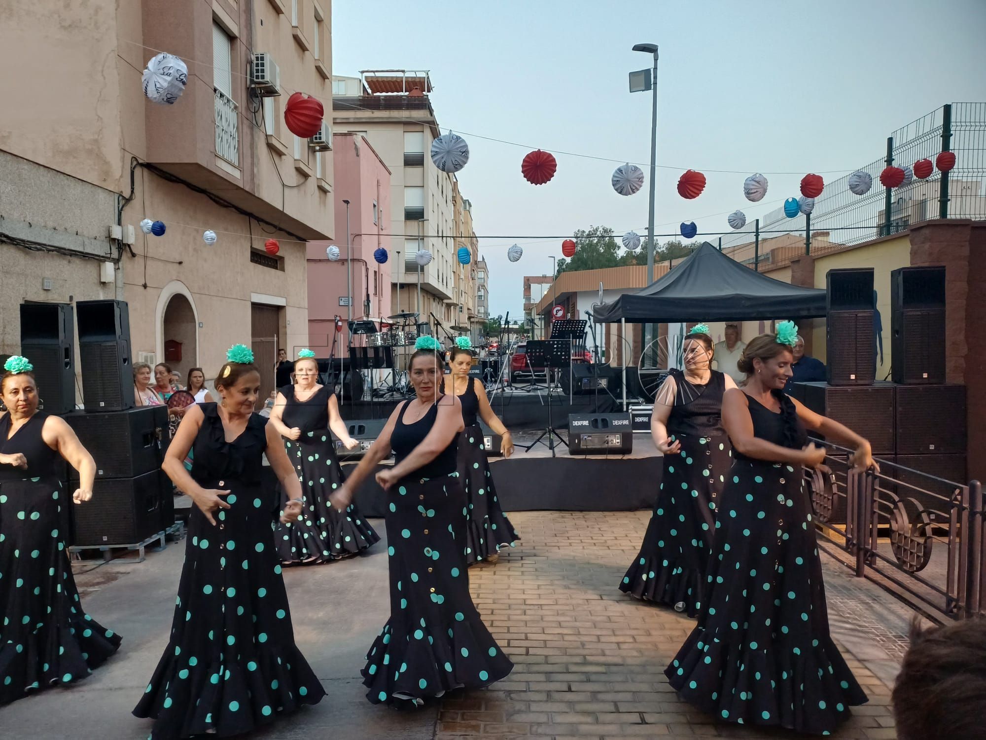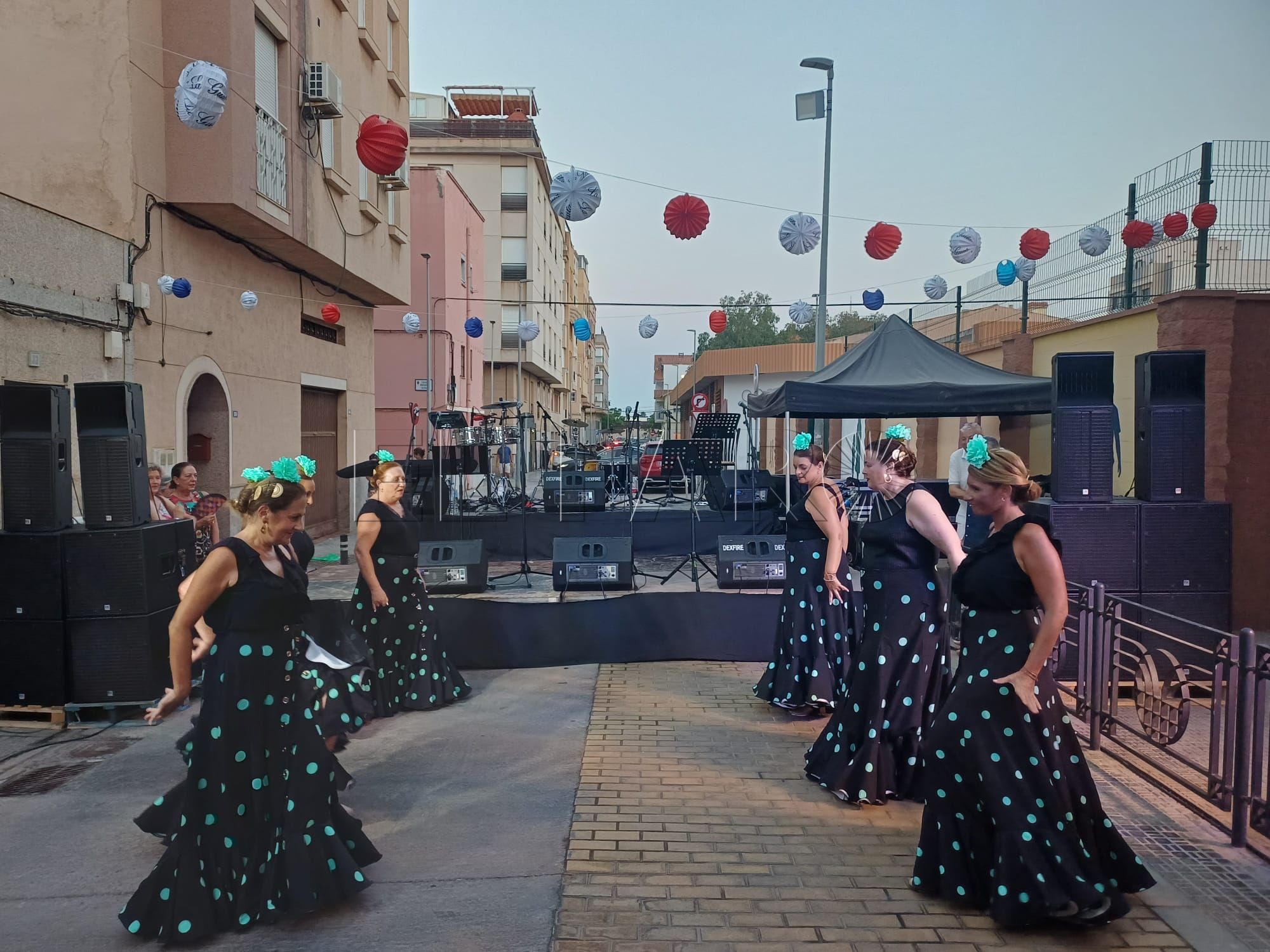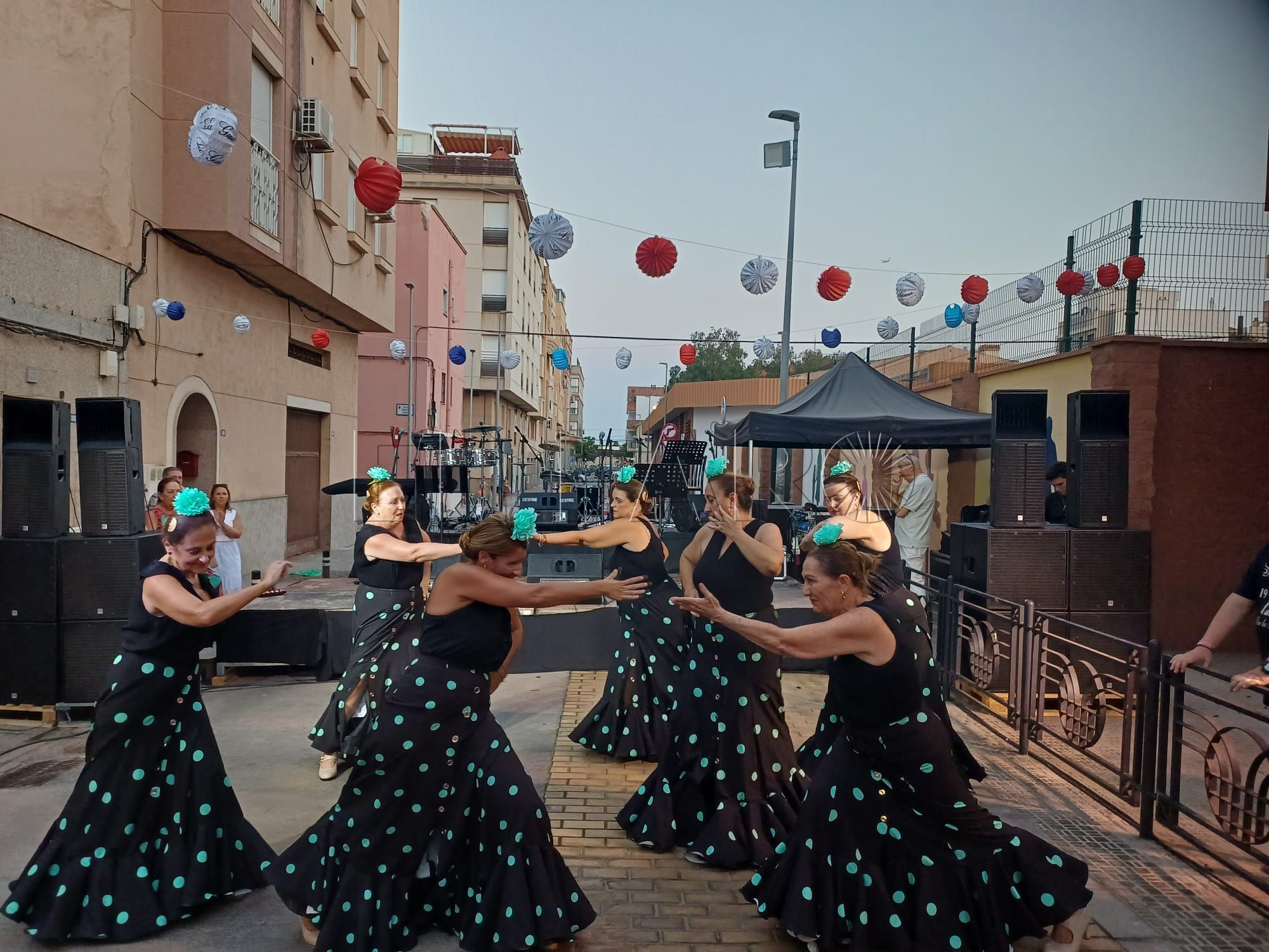 Una vez inaugurada la verbena. Los presentes han sido recibidos por una sesión musical para ambientar el encuentro. Poco antes de las 21:00 horas, le llegó el turno al grupo de baile 'Miénteme', el cual ofreció su actuación aportando ritmo y color a la noche.