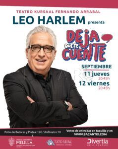 El popular cómico Leo Harlem llegará a Melilla próximamente con dos citas para presentar su nuevo espectáculo, ‘Deja que te cuente’, en el que recorre lo mejor de sus monólogos en un espectáculo tronchante durante 90 minutos.