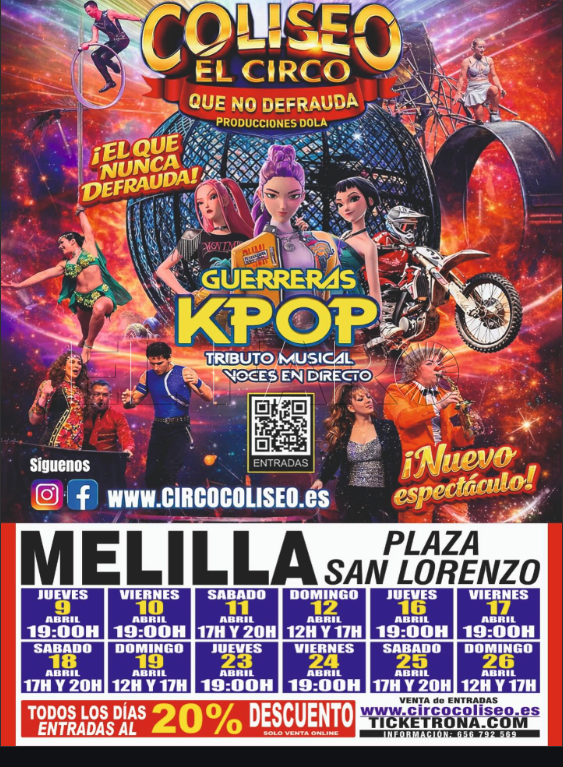 El Circo Coliseo, por su parte, presenta un espectáculo que incluye, entre otras actividades, este show musical K-pop. Entre el 9 y el 26 de abril, los melillenses podrán ser testigos del talento circense en la Gran Carpa del recinto ferial, en la Plaza de San Lorenzo, con entradas a partir de 12 euros. La venta es a través de la web www.circocoliseo.es.