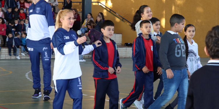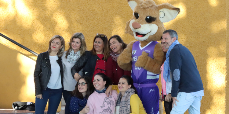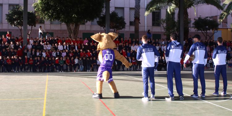 Los jugadores de la escuadra melillense y Meli, la mascota del Decano, han hecho las delicias de los niños y niñas que se han dado cita en el patio del centro educativo.