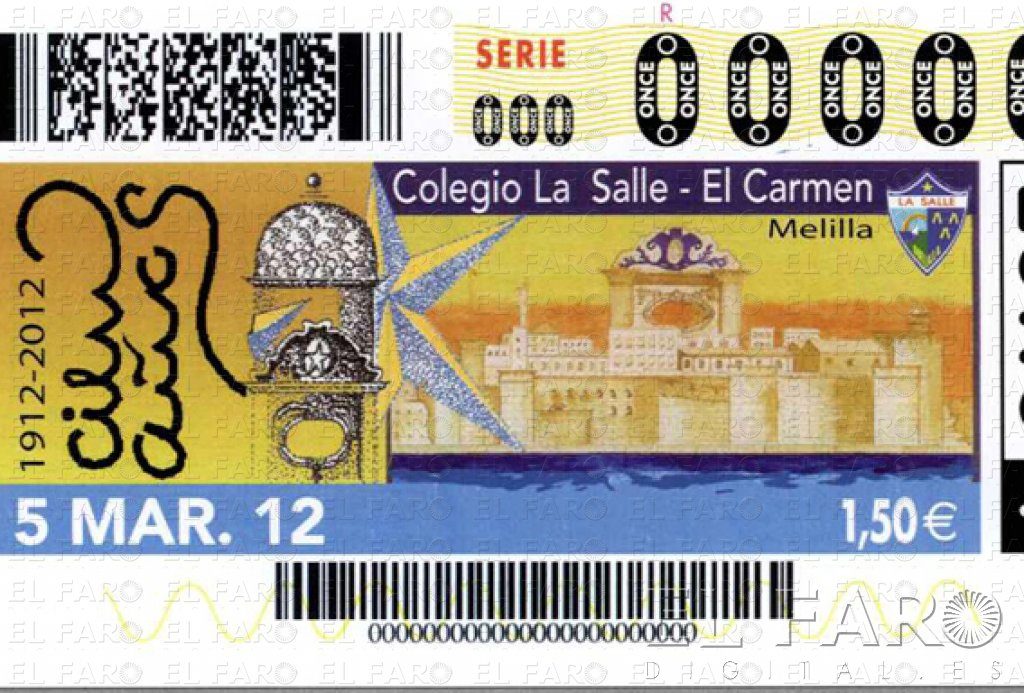 La misma iconografía que aparece en la web de este centro y en los carteles que anuncian la celebración de este centenar de años trabajando por la docencia en Melilla será el motivo de este cupón de la ONCE, incluso cuenta con el escudo del centro. Se puede distinguir en esta imagen la estrella, un símbolo muy destacado de esta entidad docente, Melilla La Vieja y la portada del edificio que acoge La Salle-El Carmen.