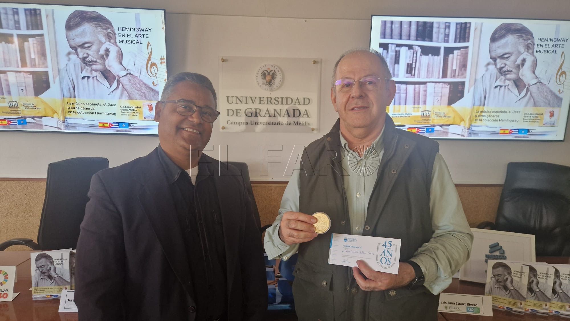 La Sala de Grados del Campus de Melilla de la Universidad de Granada acogió este pasado miércoles, 15 de abril, la entrega del reconocimiento internacional “Condición Aniversario 45”, otorgado por la Universidad de Cienfuegos “Carlos Rafael Rodríguez” de Cuba a los profesores doctores César Augusto Solano Gálvis y Juan Antonio Vera Casares, en reconocimiento a su trayectoria académica y contribución institucional.