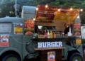 La carne chisporrotea sobre la plancha mientras clientes hacen cola con sonrisas ansiosas. Las hamburguesas, de carne jugosa y pan artesano, se acompañan con patatas al estilo rústico y salsas caseras.