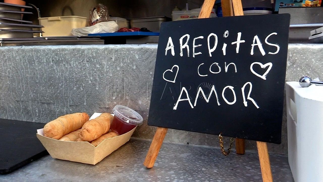 Javier, otro de los protagonistas, llega con un foodtruck venezolano que ya es un clásico en estas fechas. “Este es nuestro tercer año consecutivo. Ofrecemos arepas sin gluten —de pollo, ternera o vegetarianas— y tequeños, todo 100% hecho a mano”.