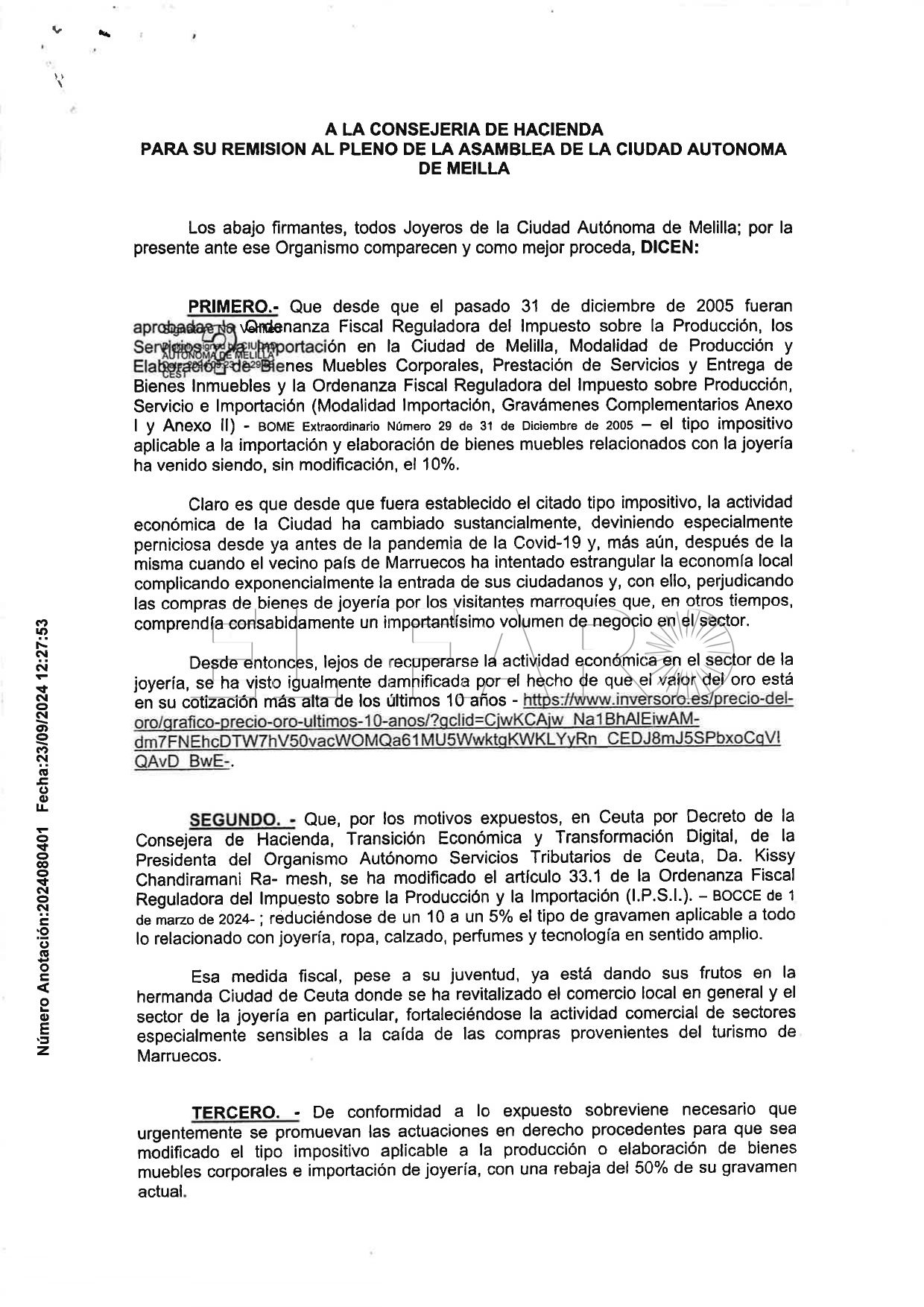 En Ceuta, territorio hermanado, los joyeros emprendieron esta iniciativa que resultó exitosa: en el año 2023, su Gobierno redujo el IPSI del 10 al 5 %. Las noticias llegaron a Melilla, y este sector inició los trámites para partir de las mismas condiciones que los negocios ceutíes, pese a que no son competencia, señalan.