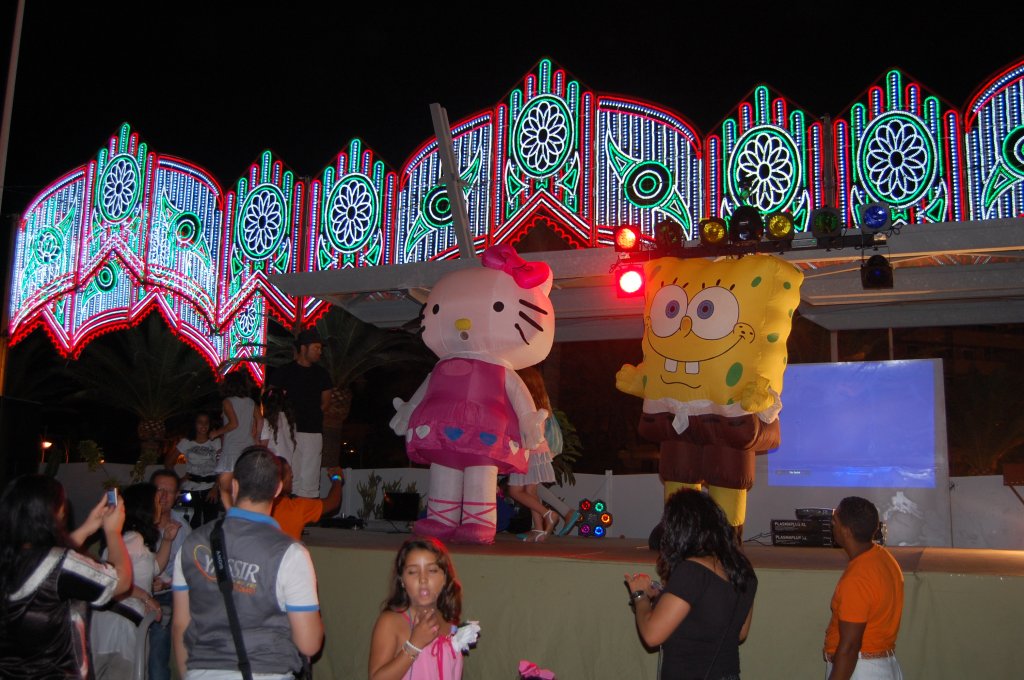 Algunos de los personajes que han hecho las delicias de los menores durante este curso académico y que también han visitado las instalaciones del Real de la Feria, como es el caso de Bob Esponja, visible en los carricoches y en otros lugares específicos para los más menudos.