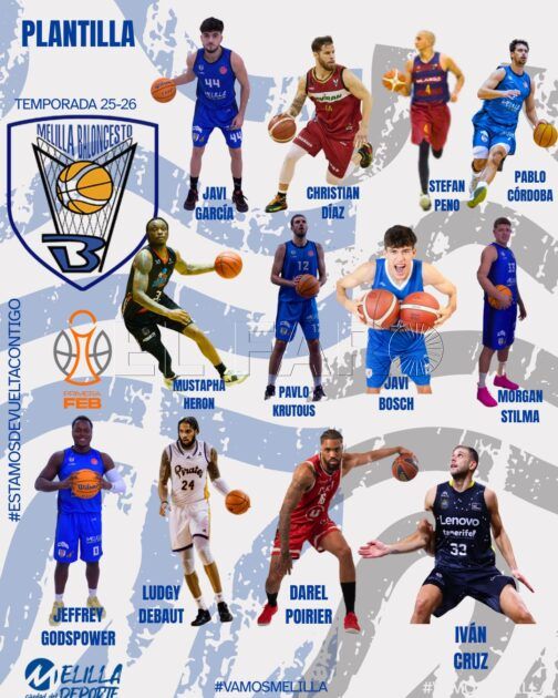 Con este plantel, la entidad melillense ha apostado por una mezcla de talento, físico y experiencia internacional, con la intención de ser uno de los equipos dominantes de la Primera FEB desde la primera jornada.