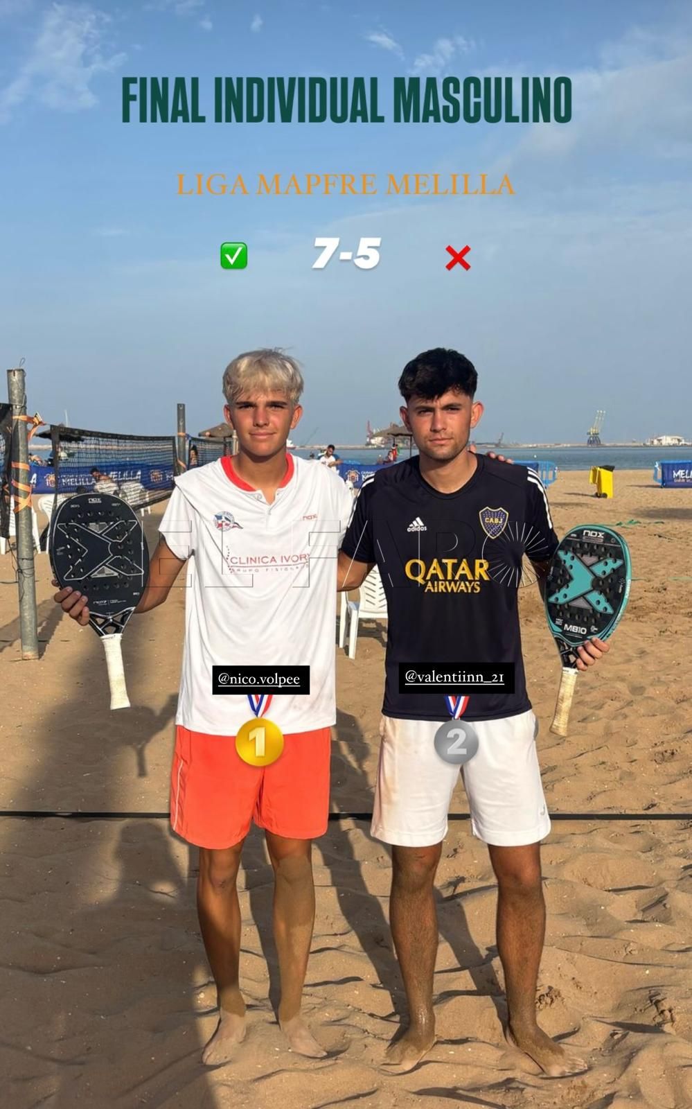 En cuanto a los primeros campeones de esta competición nacional hay que señalar que la melillense María Martínez vencía en la final a la canaria Eva Santana por 7-2, mientras que Nicolás Volpe vencía a su hermano Valentín Volpe por 7-5. Durante toda la jornada de este pasado sábado fueron muchos los partidos que se disputaron en la arena melillense y donde todas las parejas buscaron con ahinco meterse en la gran final. Desde primera hora de la mañana del domingo se disputarán las finales, estando programado realizar la entrega de trofeos a las 13:30.