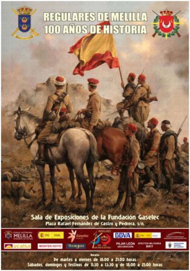 La muestra sobre la Unidad más condecorada del Ejército Español, los Regulares, cuya historia, desde su creación en 1911, está íntimamente ligada a la de Melilla, recorre sus cien años de vida a través de sus hechos gloriosos, tradiciones, uniformes, armamento, banderas, himnos, etc., que dejan en el visitante una idea clara de lo que han sido las Fuerzas Regulares desde su fundación hasta nuestros días.
