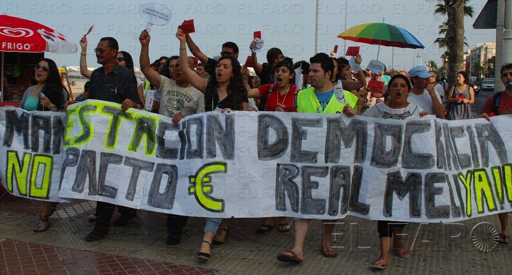 Medio centenar de personas pertenecientes al movimiento ciudadano ‘Democracia Real Ya’ (DRY) de Melilla se manifestó en la tarde de ayer para mostrar su repulsa ante la inminente aprobación del Pacto del Euro.
