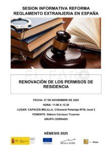 Asimismo, esta asociación también realizará mañana una sesión informativa para profesionales de Capaces Melilla. Una charla enmarcada en el Grupo Némesis que versará sobre la reforma del reglamento de extranjería en España y, más concretamente, acerca de la renovación de los permisos de residencia. Esta charla será impartida por la experta en derecho, Débora Carrasco.