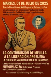 Organizada por la Asociación Fórum Filosófico de Melilla para el Pensamiento y la Educación, junto con la Fundación Mohamed Khadir El Hammouti - "Soldado Africano" para la Memoria del Rif y el Norte de África; esta charla contará con la participación del historiador y profesor de la Universidad Mulay Ismail de Mequinez, Mimoun Aziza.