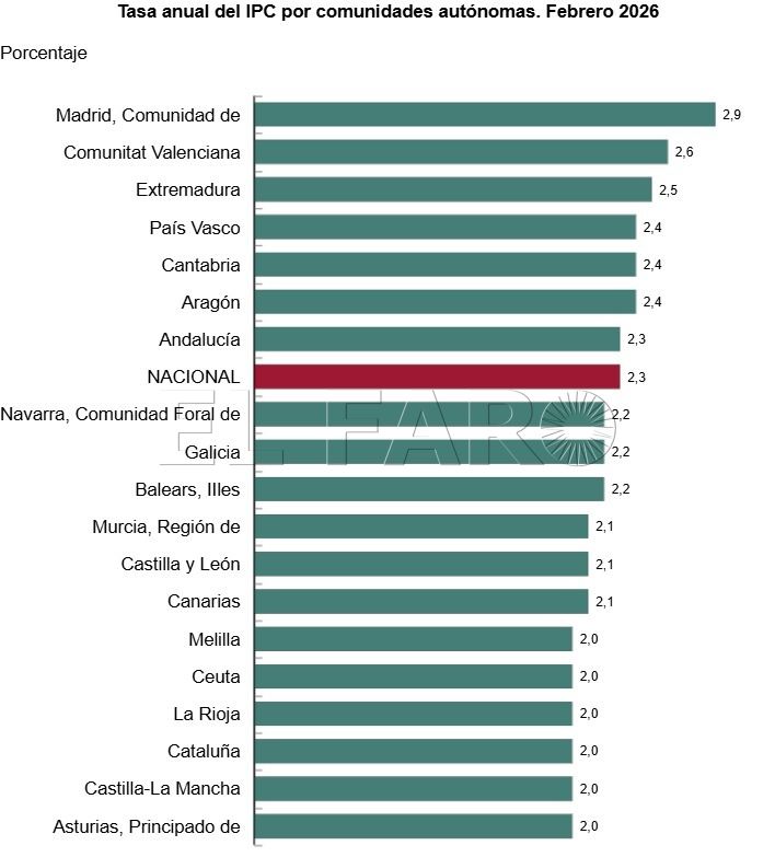 En relación a la variación interanual, Melilla es además la única región en la que el aumento del IPC también se quedó por debajo del 2%. En el extremo opuesto, la subida del IPC más acusada, por encima de la media (2,9%), fue la registrada en Cataluña (3,6%), Cantabria (3,5%), Baleares (3,2%) y Castilla y León (3,1%). Al mismo nivel del conjunto de la nación se quedaron Murcia, Navarra y La Rioja.