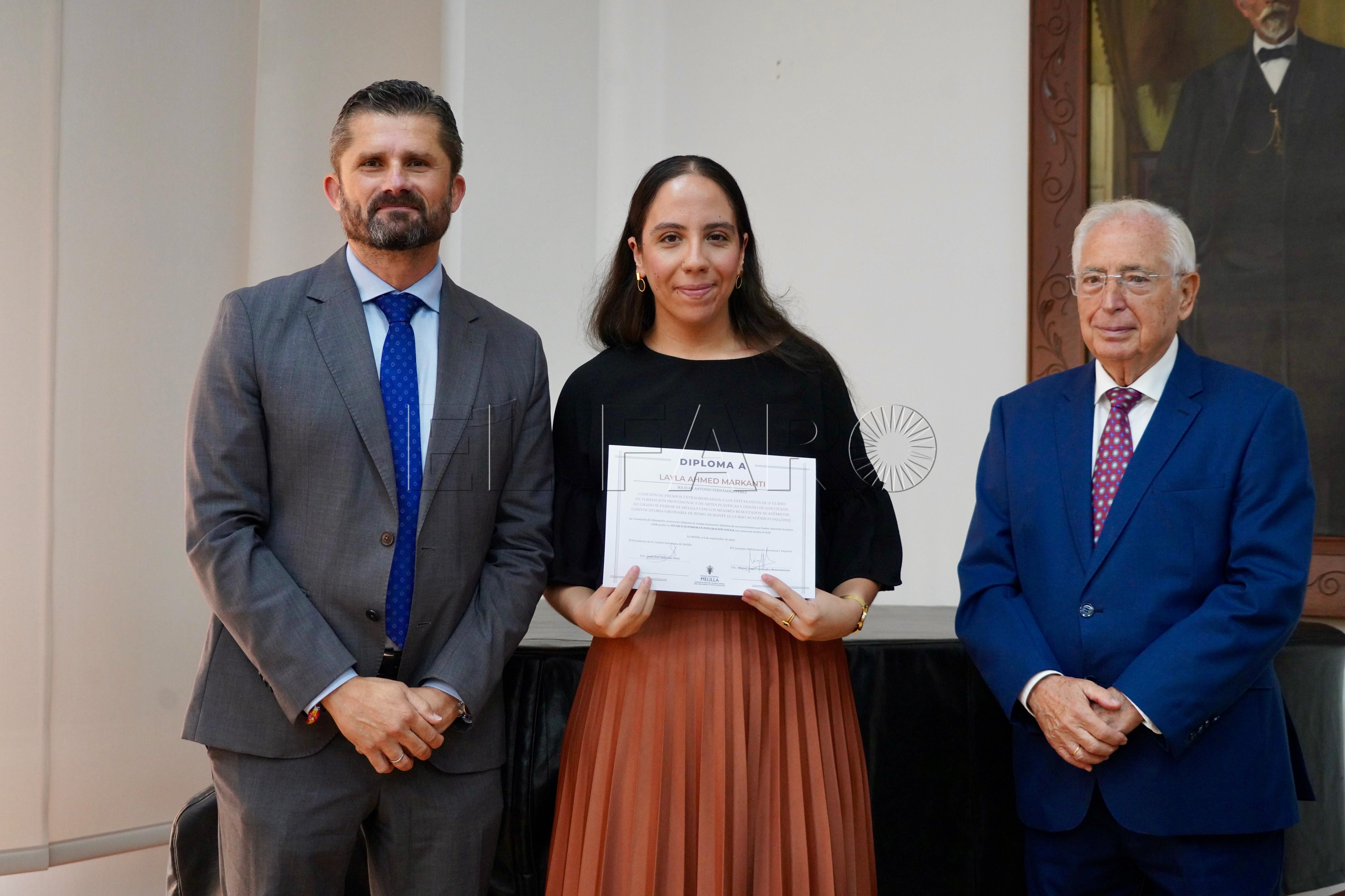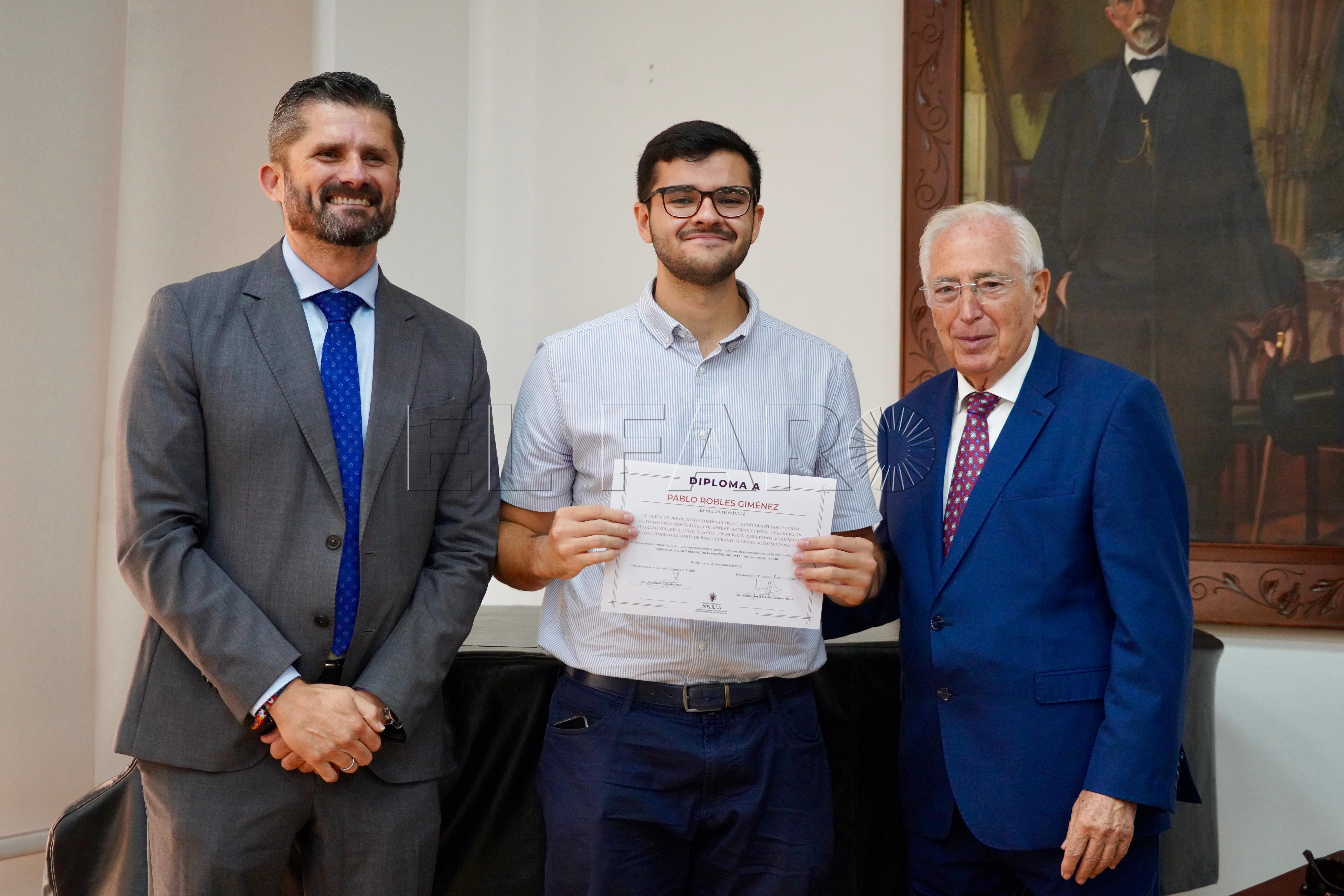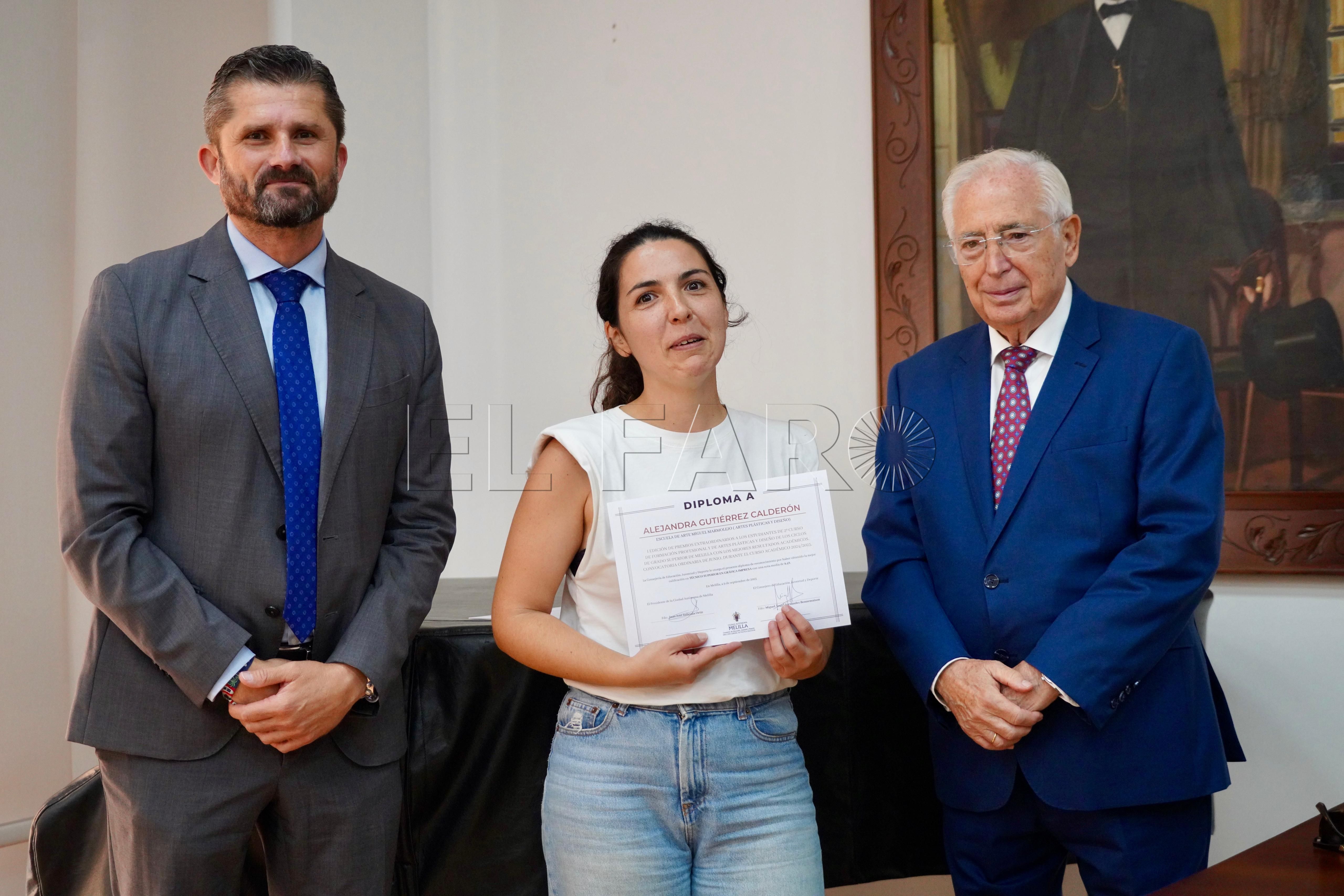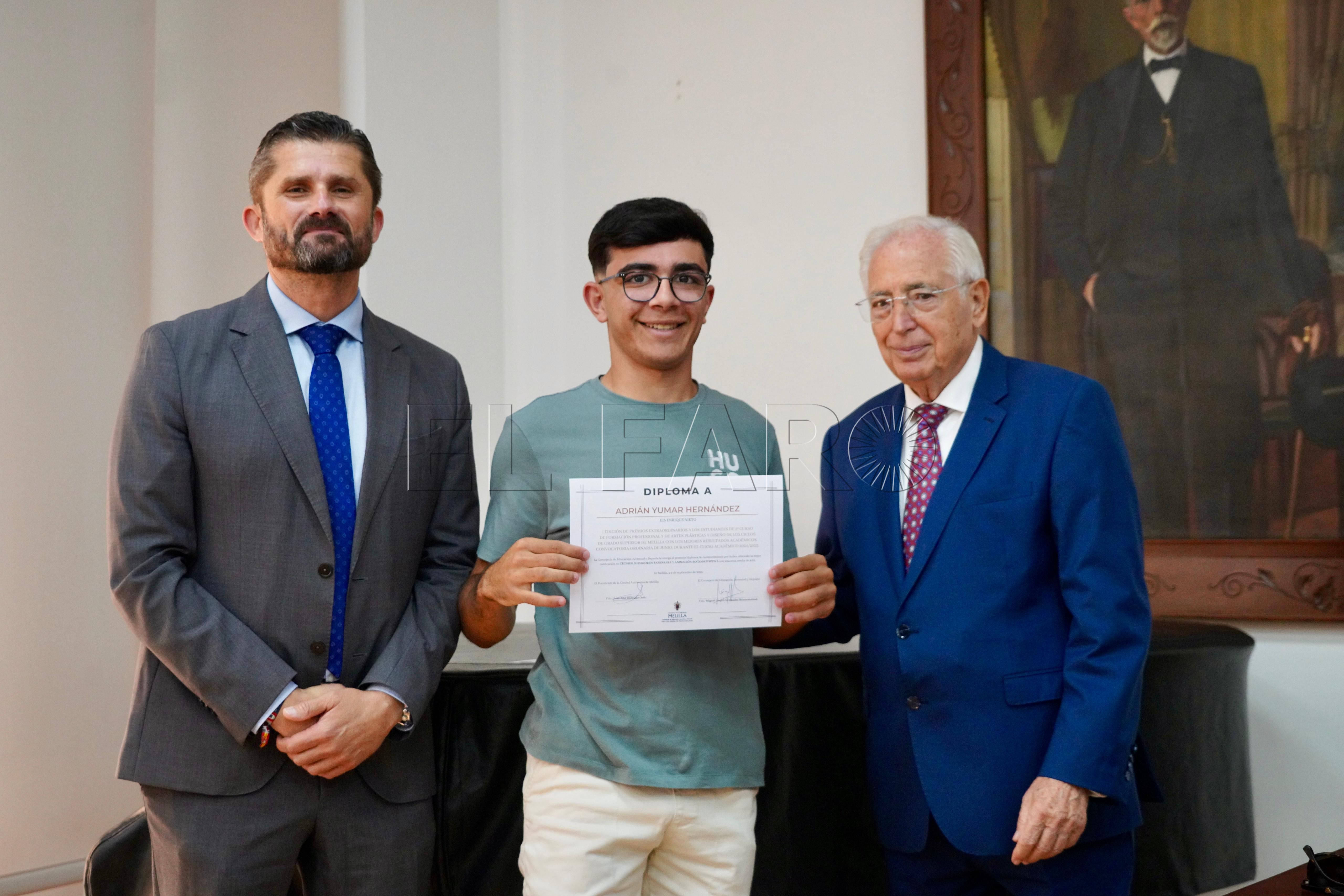 La Consejería de Cultura ha acogido esta mañana, a las 12:15 horas, la entrega de premios a los mejores expedientes de Formación Profesional y enseñanzas artísticas de la ciudad. El acto ha contado con la presencia del presidente de Melilla, Juan José Imbroda, el consejero de Educación, Miguel Ángel Fernández, y el director general de Política Educativa, David Azancot.