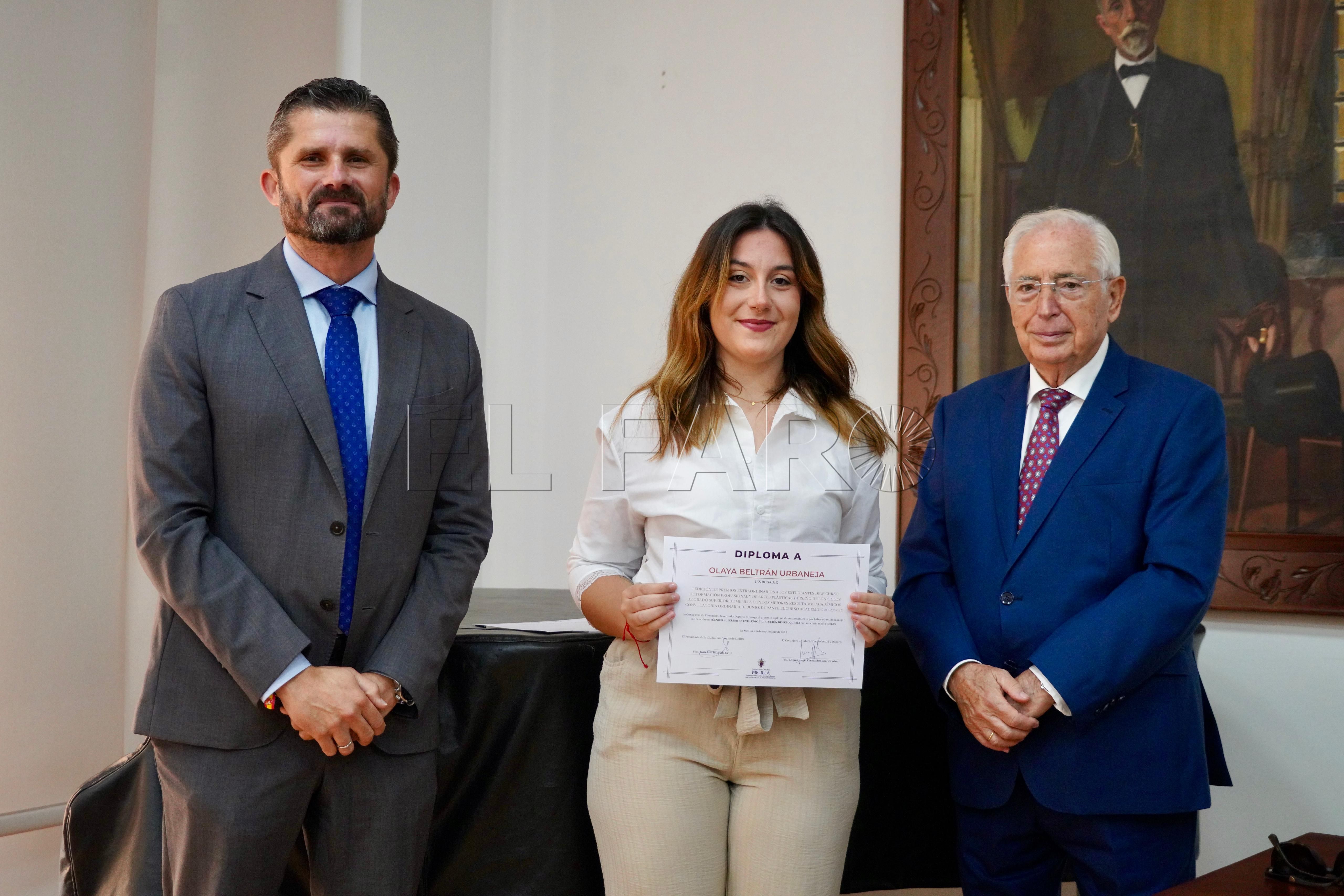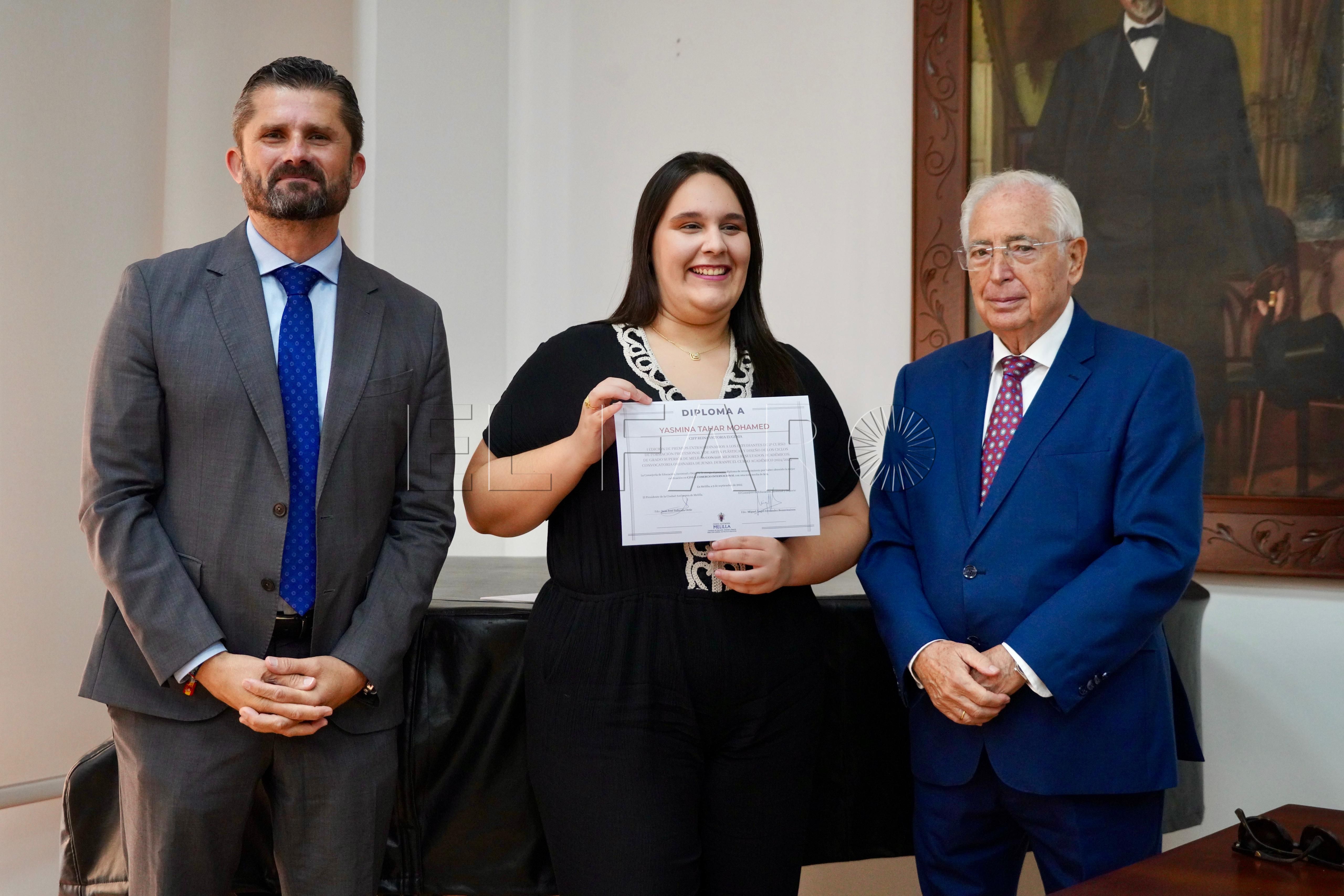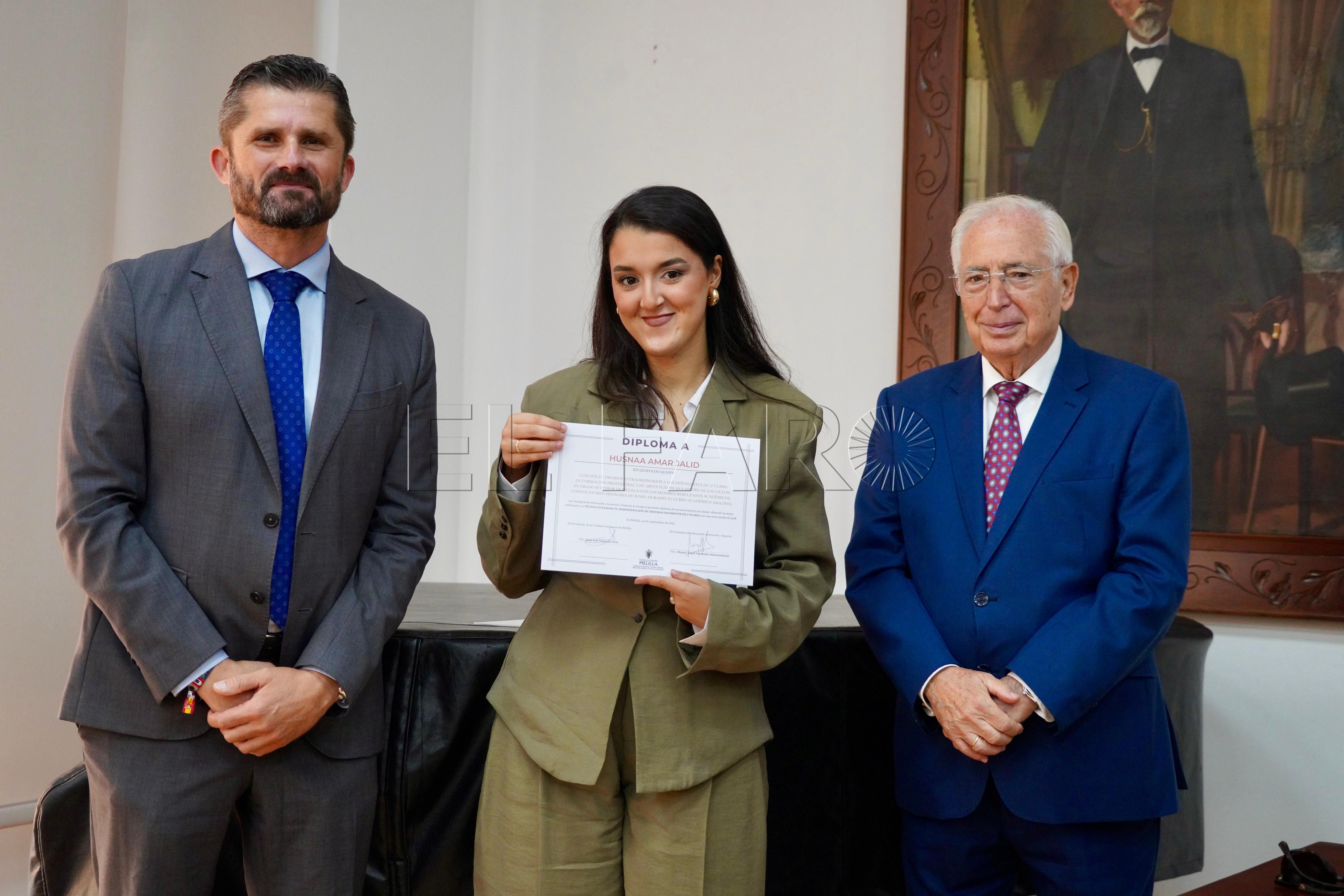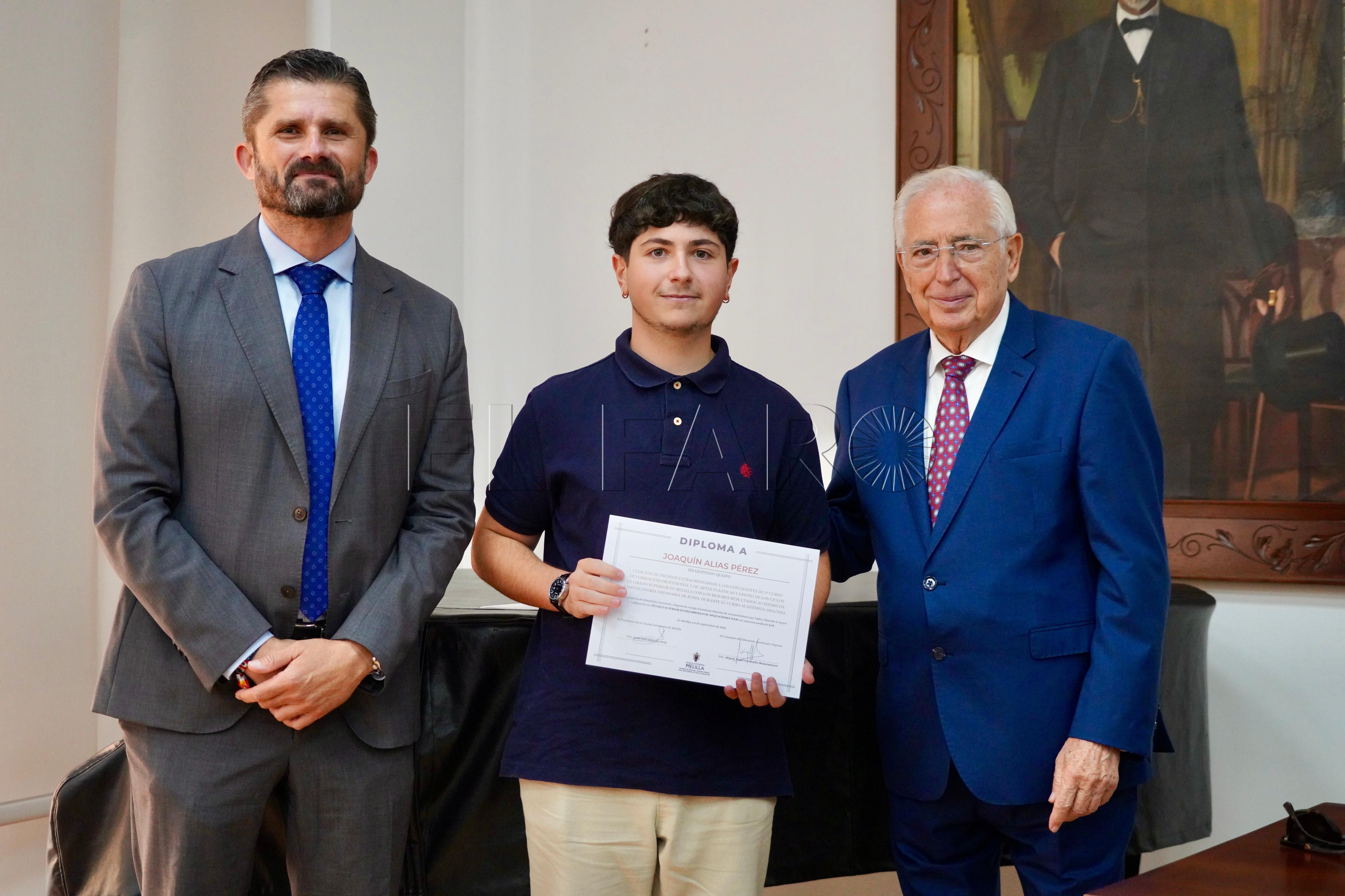 La Consejería de Cultura ha acogido esta mañana, a las 12:15 horas, la entrega de premios a los mejores expedientes de Formación Profesional y enseñanzas artísticas de la ciudad. El acto ha contado con la presencia del presidente de Melilla, Juan José Imbroda, el consejero de Educación, Miguel Ángel Fernández, y el director general de Política Educativa, David Azancot.