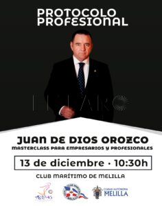 Juan de Dios Orozco, especialista en protocolo, comunicación estratégica y atención al cliente del sector del lujo, visita Melilla los días 12 y 13 de diciembre para ofrecer una serie de charlas dirigidas tanto a empresarios como a estudiantes de Formación Profesional. La iniciativa, organizada por la Asociación Empresarial Activas, se celebrará en el Club Marítimo de la ciudad y busca acercar a la sociedad melillense una formación de alto nivel en ámbitos cada vez más demandados, como el protocolo profesional, la gestión de la imagen, la oratoria, la organización de eventos institucionales y la atención personalizada en entornos de alta exigencia.