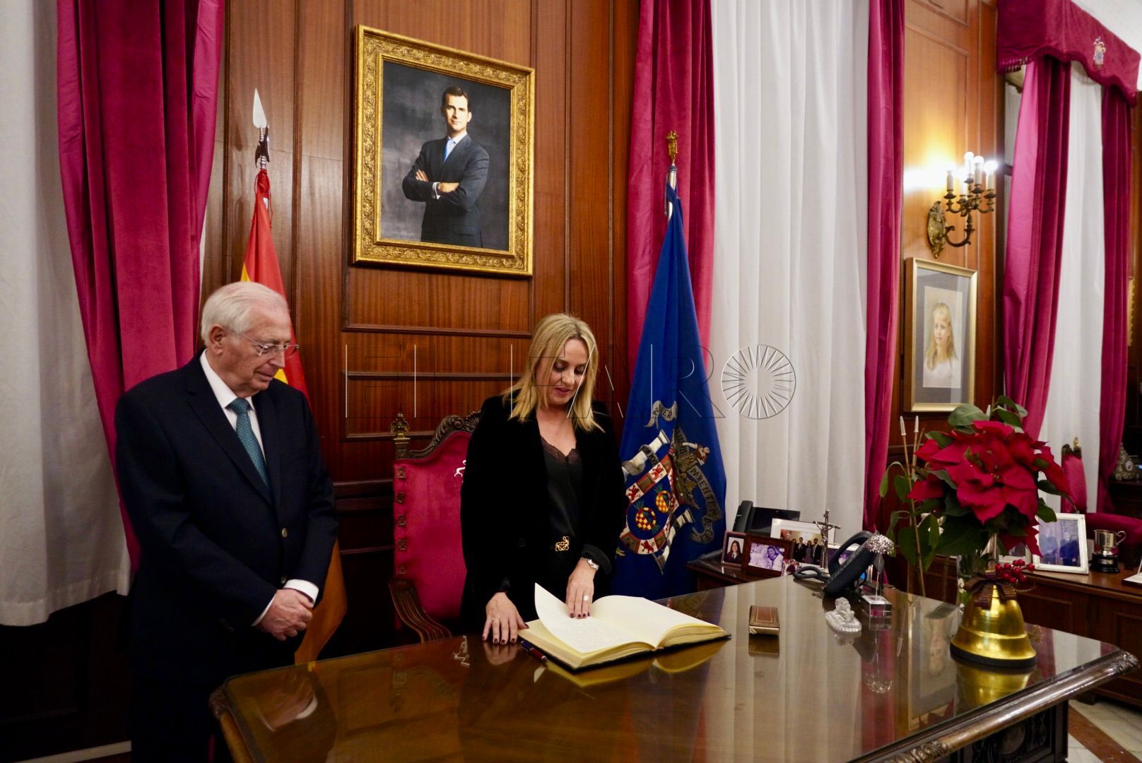 La alcaldesa ha sido recibida en el Palacio de la Asamblea por el presidente de la Ciudad Autónoma, Juan José Imbroda, acompañado del vicepresidente Primero y la vicepresidenta Segunda, Miguel Marín y Fadela Mohatar.