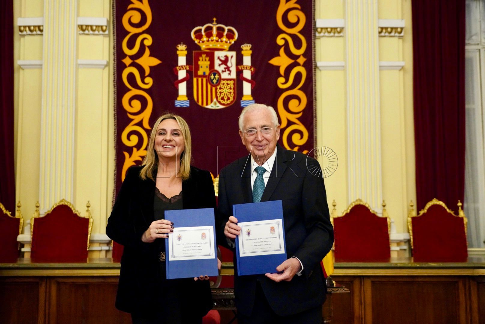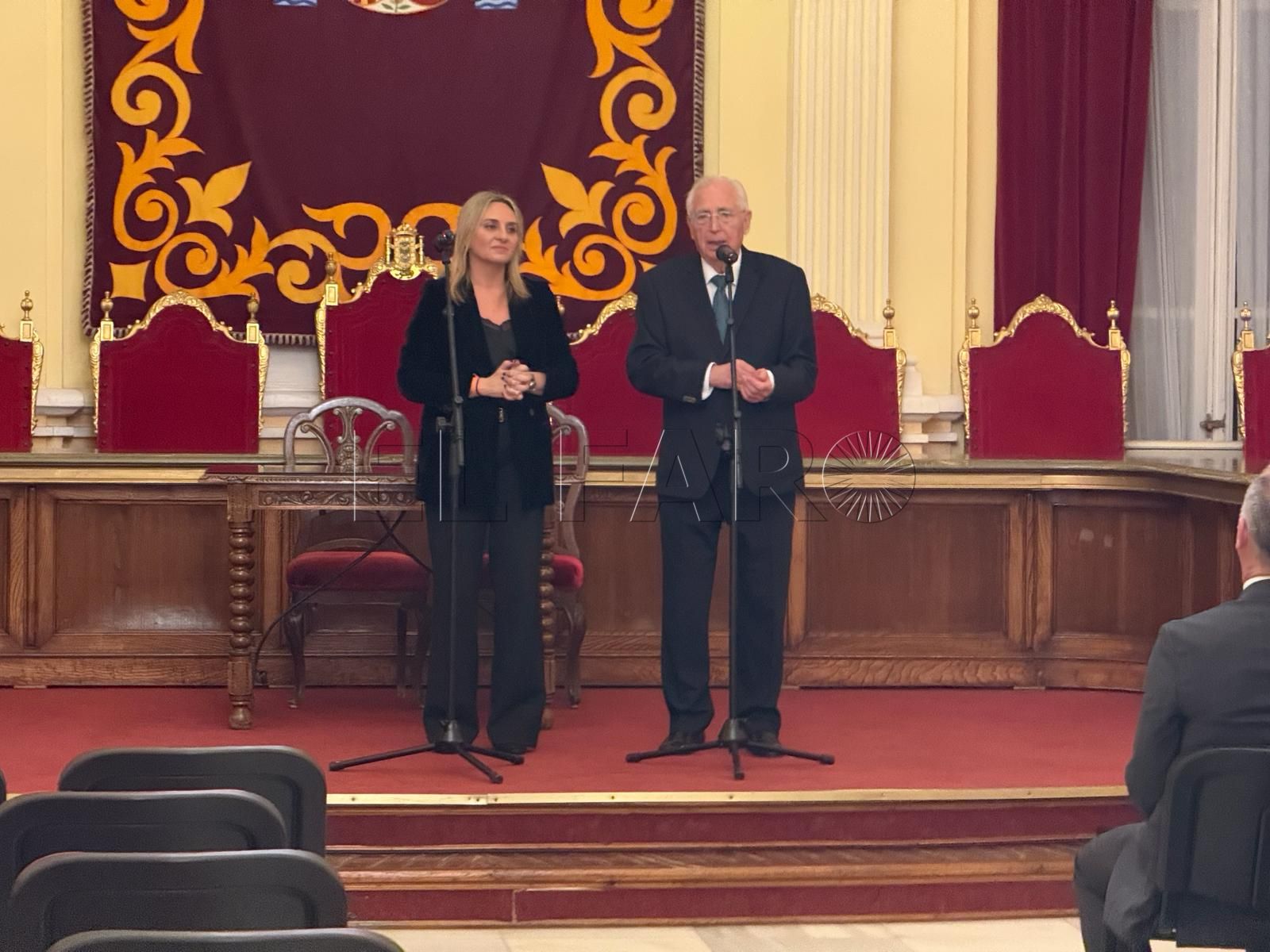 A continuación, ha llegado el momento de los regalos. La Ciudad ha obsequiado a María Francisca Carazo con una réplica del Palacio de la Asamblea, mientras que la alcaldesa ha entregado una corbata al presidente Imbroda.